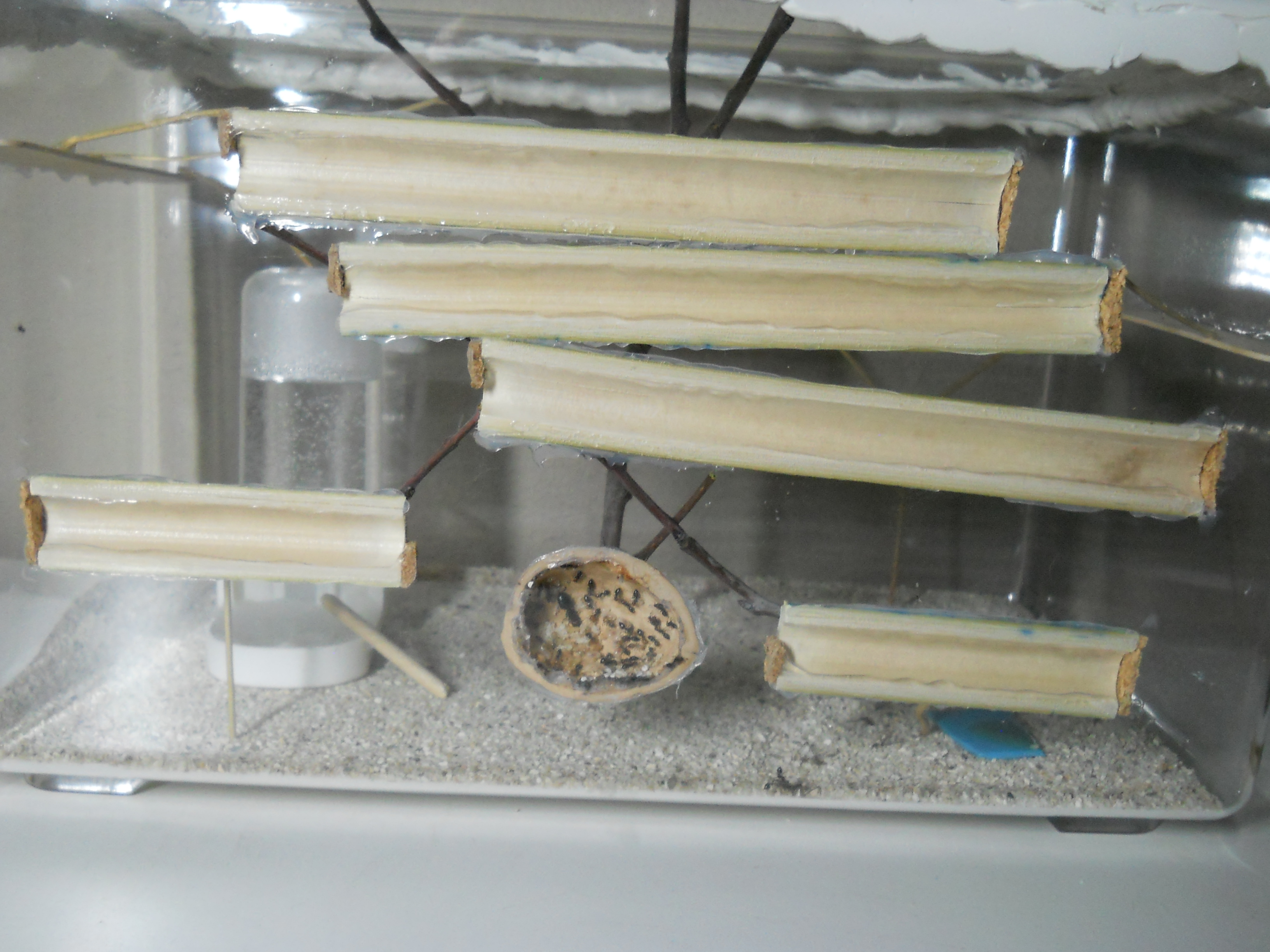 Nel frattempo sono state trasferite nel nuovo nido costruito prendendo ispirazione da quelli già creati da alcuni utenti di questo forum, cioè composto da sezioni di canne incollate alla superfice trasparente dell'arena.