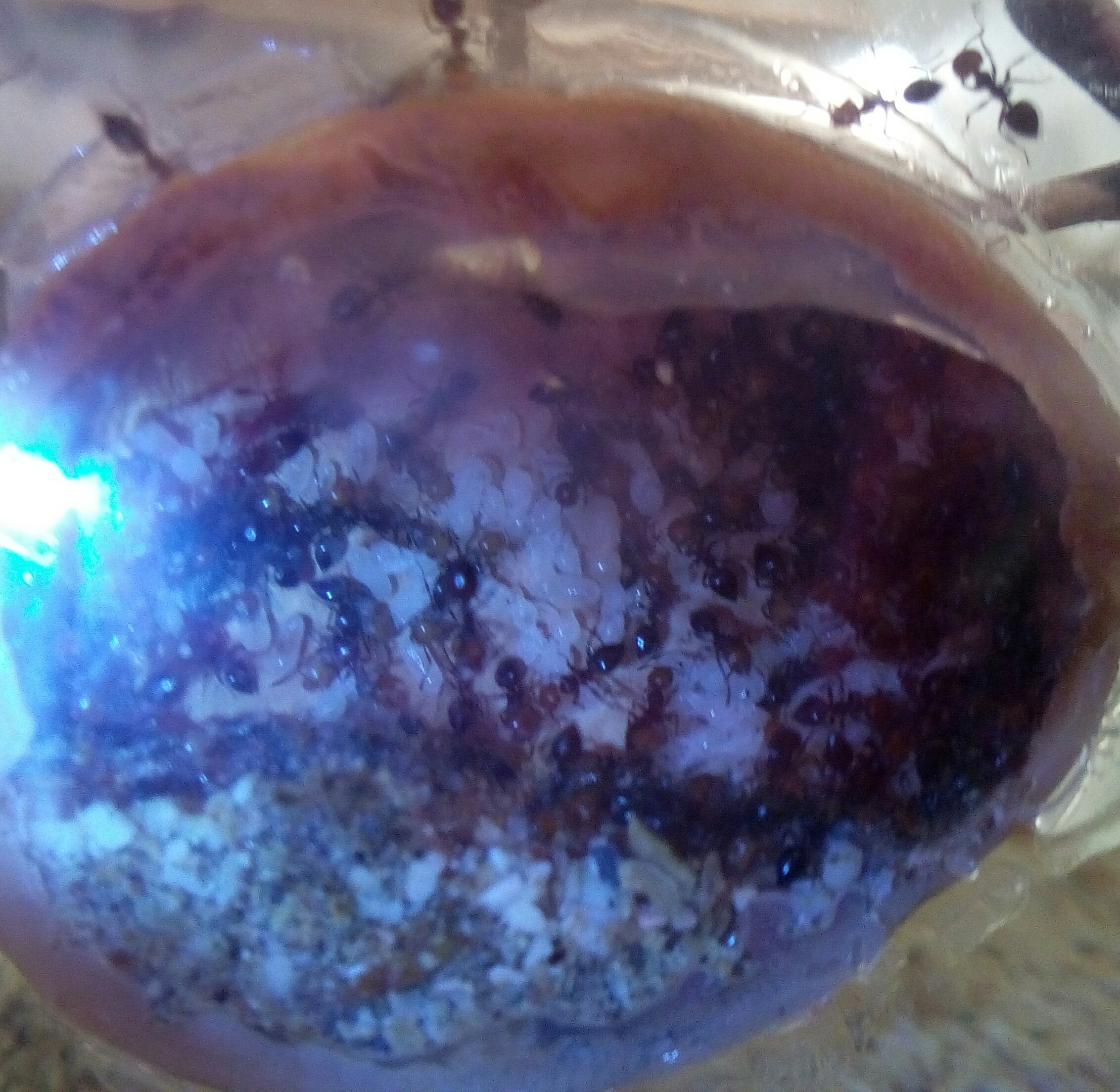 Questo è stato fatto non per mancanza di spazio nel vecchio formicaio, ma per poter assecondare lo sviluppo della colonia per almeno quest'anno. Per quanto riguarda l'alimentazione noto sempre con maggior piacere il fatto che non siano per niente esigenti e che divorino qualsiasi cibo fonte di proteine; inoltre ho osservato una preferenza verso ho zucchero grezzo di canna rispetto al miele