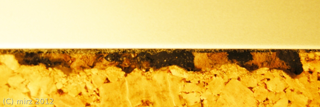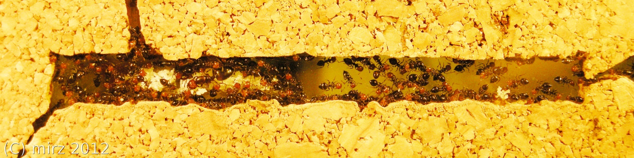 1 - Da un piccolo oblò si scorge qualcosa che si muove; è una piccola operaia che mordicchia il sughero e sembra dire: «Che ti guardi? Qui si lavora e tu ti trastulli!». Le "minatrici" hanno scavato, dalla camera di areazione (1), una galleria a cielo chiuso di oltre un centimetro che si apre su una finestra (2) di circa 3x4mm.