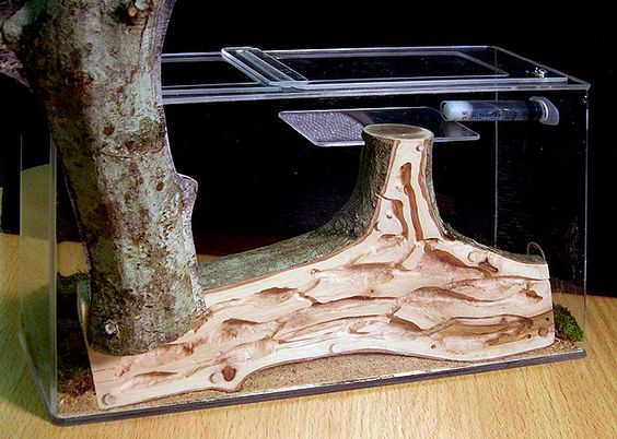 Io mi sono fatto un bel progettino di un antquarium con nido scavato in un tronchetto da inserire meta' dentro la teca e meta' fuori, a coprire. Per l'arena mi rifaro' alla classica colata di gesso+ addobbi vari, Il tutto dovrebbe dare un effetto di estrema naturalezza, almeno spero.