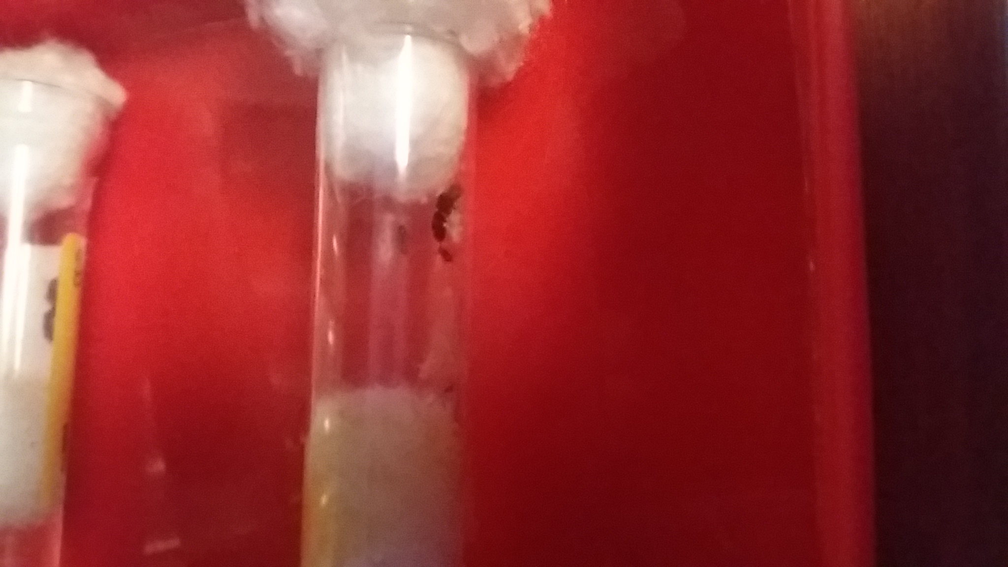 Noto dalla parte del cotone dove vi è l'acqua dei piccoli puntini neri, potrebbe essere che la provetta non sia idonea ad ospitare la regina?Tra l'altro in quel punto vi è la scheggia di prosciutto e il corpo della prima operaia.Forse ho sbagliato a non rimuoverli ma non volevo arrecare disturbo alla colonia.