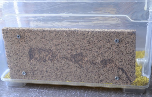 Inoltre, come anticipato in un post precedente, ho voluto studiare il comportamento di queste formiche applicando ad una parete dell'arena, una piccola 'lastra' in sughero con 3 camere...volevo solamente verificare in quale momento (dimensione della colonia), si sarebbero potute trasferire spontaneamente (e se si sarebbero trasferite). Da qualche giorno ho notato varie operaie girovagare per l'intera arena, esplorando completamente anche la parte in sughero, stiamo a vedere...in ogni caso presto provvederò ad applicare il coperchio all'arena con antifuga anche a tetto