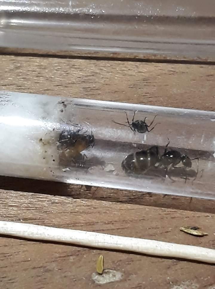 La colonia conta tre operaie, due pupe,una decina di larvette e una manciata di uova.