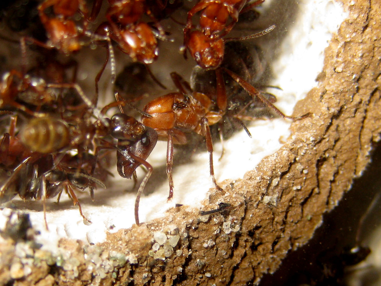 Molte operaie di entrambe le specie hanno il gastro gonfio, dovuto anche ad alcuni rifornimenti dati nell'ultimo mese, che sembra le formiche abbiano gradito.