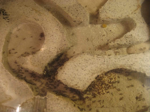 La mia colonia di Lasius emarginatus è alimentata con 2 camole a settimana circa...e conta di più di 50 operaie. Quindi, come vedi, forse hai un pò esagerato con il cibo (che ti consiglio di togliere e sostituire con dell'ovatta imbevuta di acqua e miele o solo una gocciolina piccolissima di miele).