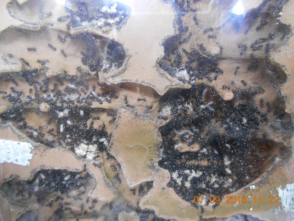 2016-08-25 - Colonia cresce in continuo. Ho problemi di mantenimento umidità nel nido in gesso.. Ora siamo in una situazione caotica. Le larve e le pupe sono raggruppate in arena. un po' sotto i tappini del cibo, un po' nel tappino dell'acqua e addirittura parte di covata dentro il beverino per uccelli. Ho collegato il nido a un nido in gessoceramico immerso in acqua per maggiore umidificazione. Parte della colonia si è già trasferita ma il resto rimane saldamente legato al vecchio territorio. Oggi ho acceso una lampada a LED proprio sulla zona della covata.