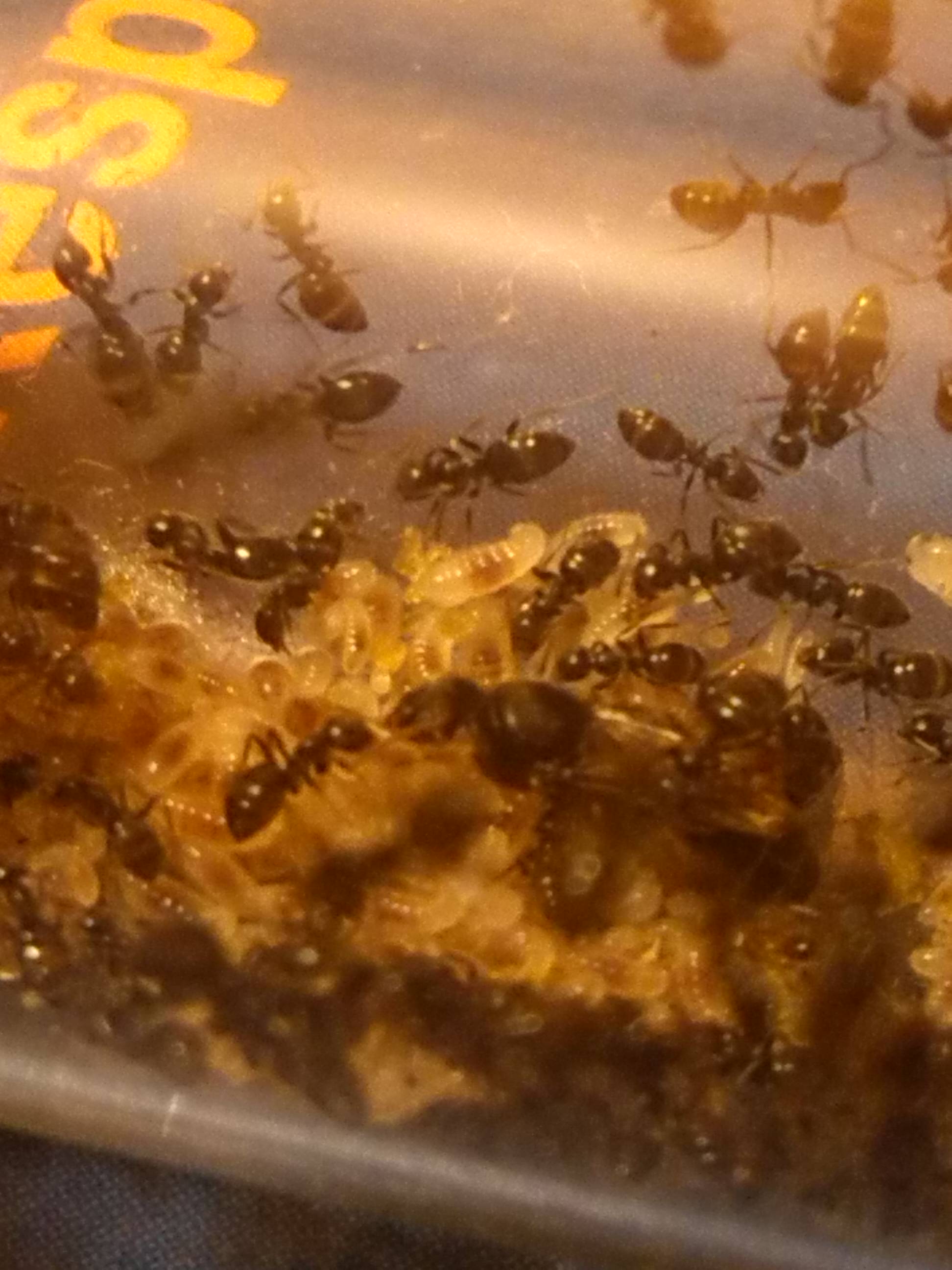 Durante il trasferimento pian piano si scoprivano montagne di larve e di uova e dopo che la maggior parte delle operaie era nella nuova provetta ho finalmente visto la regina che era tirata per le antenne da delle operaie.