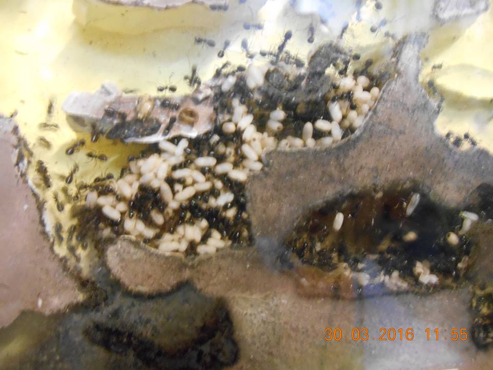 2016-03-30 - La quantità di pupe è incredibile, hanno riempito la parte bassa del formicaio. Ora la colonia è un po' meno affamate, le altre larve sono ancora molto piccole. Oggi ho notato uno strano comportamento, alcune operaie messe nella parte superiore del gruppone di pupe, vibrano agitate. Forse stanno scaldando le pupe? Mai visto farlo prima d'ora, forse anche perchè prima c'era la stufa accesa con temperature oltre i 20C adesso invece la stufa è spenta e le temperature sono dai 18 ai 21.