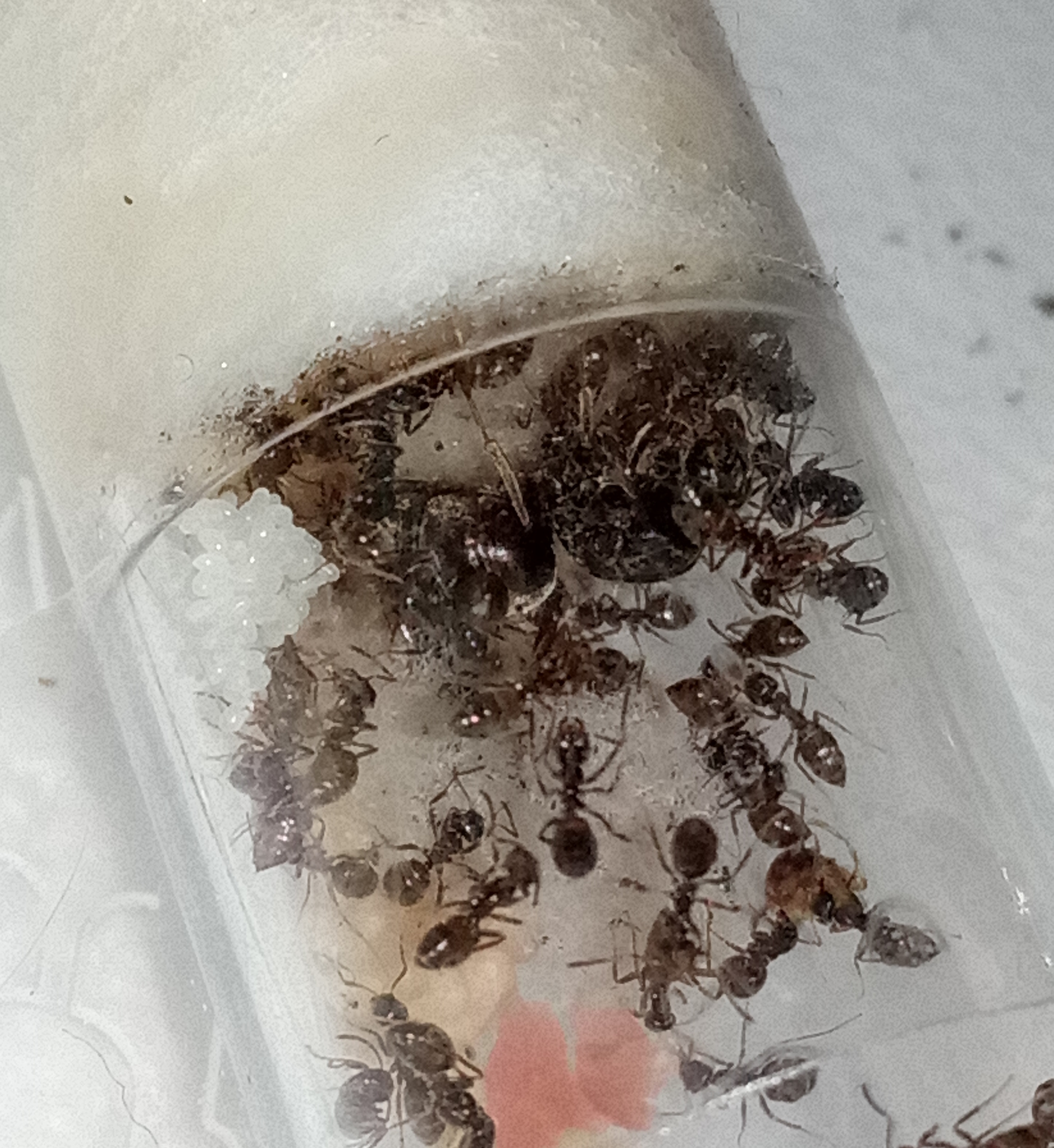 Rapido aggiornamento: la colonia è ormai nel pieno dell'attività "estiva". La covata inizia ad assumere dimensioni veramente importanti, con almeno 15-20 pupe, una ventina di larve e un numero di uova che fatico a contare (con buona probabilità più di 35-40). Probabile boom demografico in arrivo e stando ai numeri attuali pare proprio che la popolazione vada al raddoppio nel corso del prossimo mese. Visto l'aumento della popolazione ho approntato un primo formicaio di accrescimento. Il "piano" è di attendere che il numero di operaie raddoppi, portandosi intorno alle 130-150 unità, e trasferirle nel nido artificiale (formicaio in gesso a sviluppo orizzontale 15x15cm). Allo stato attuale immagino che tutto possa accadere entro 35-45 giorni da oggi. Da annotare senza dubbio anche il ritrovato appetito della colonia che divora tutto ciò che offro in arena quasi giornalmente (zanzare-mosche-piccoli ragni-prosciutto cotto e tonno per quanto riguarda le proteine; miele diluito sopra piccoli pezzi di mela per quel che riguarda gli zuccheri e carboidrati). Tutto ciò che ha dimensioni idonee ad essere trasportato all' interno del formicaio viene rapidamente selezionato e dato in pasto alle larve direttamente. L'arena è sempre pattugliata da almeno 6-7 operaie.