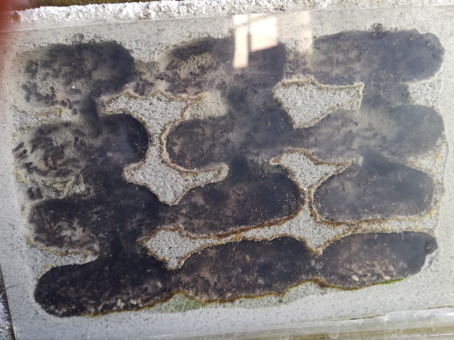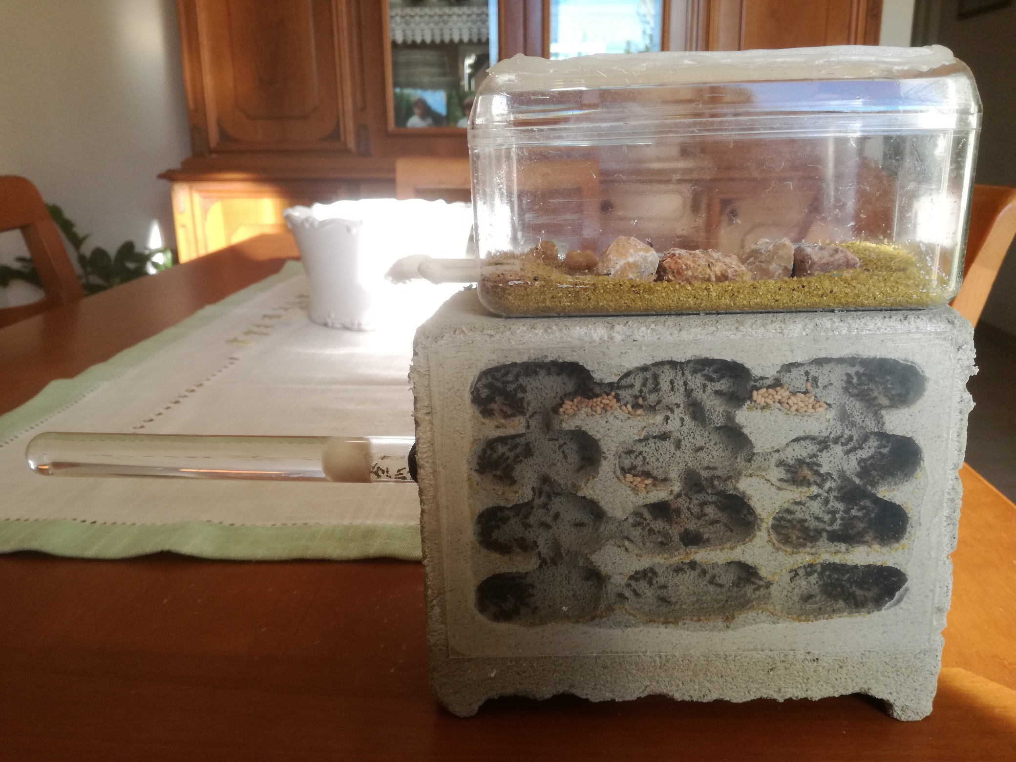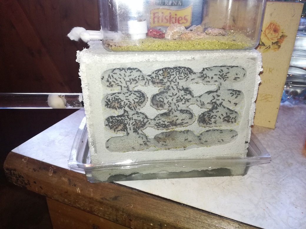 aggiorno il diario per informarvi che il 4 Luglio 2017 ho spostato la colonia in un piccolo formicaio a doppia facciata costruito con un blocco di gasbeton di 16 cm x 14 cm x 10 cm, le due provette nelle quali alloggiavo la colonia erano ormai piene... penso che il numero di operaie si aggirasse sulle 300, forse di piu'.