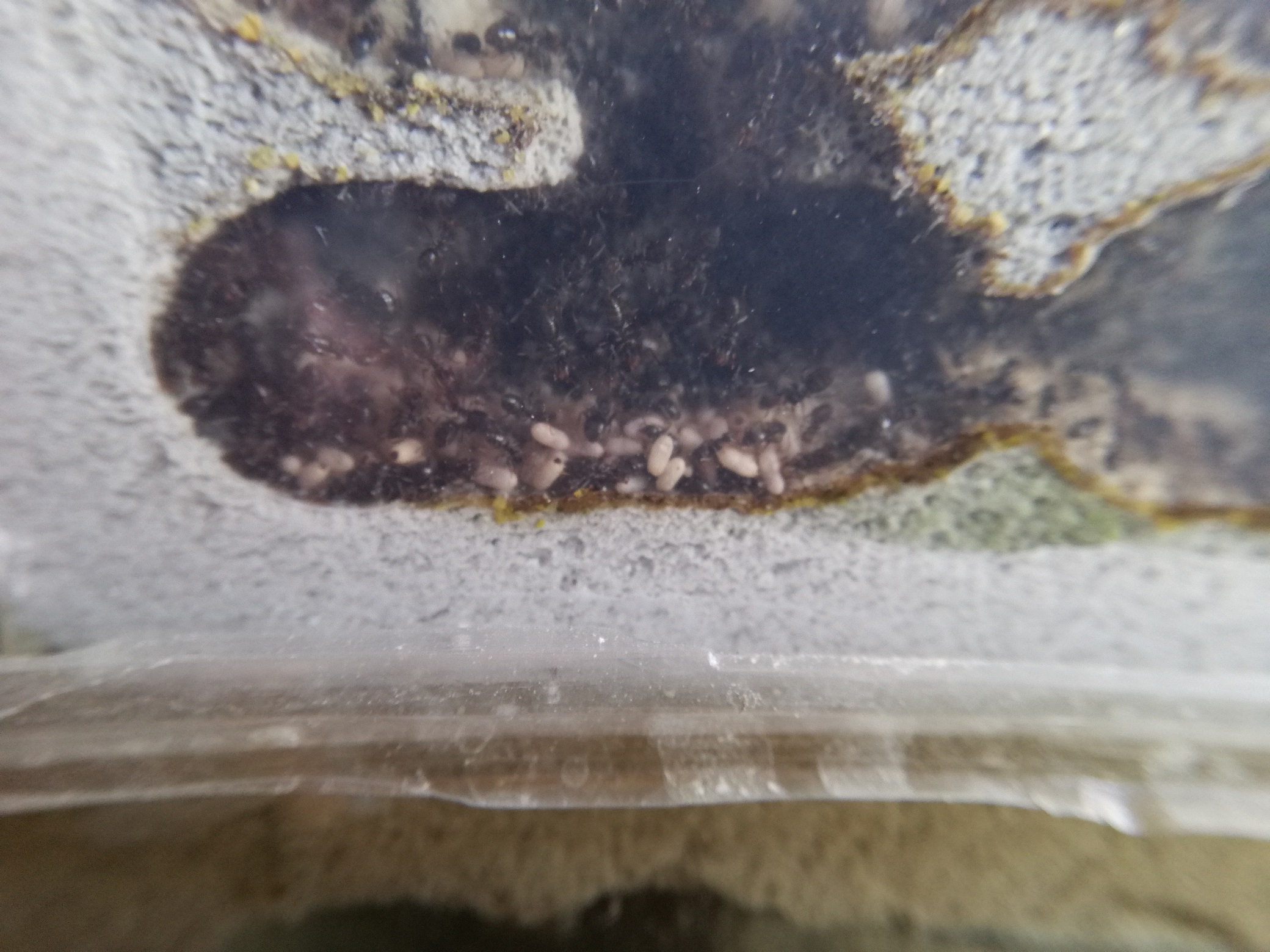 La colonia secondaria invece ha solo 5 pupe, 4 larve e molte uova (anche qui' si parla di varie decine), tuttavia come si vede dalle foto il gastro della regina e' enorme, grazie alla dieta ricca di insetti che fornisco a tutte le mie colonie, ed il surplus di proteine si riflette anche sulla covata