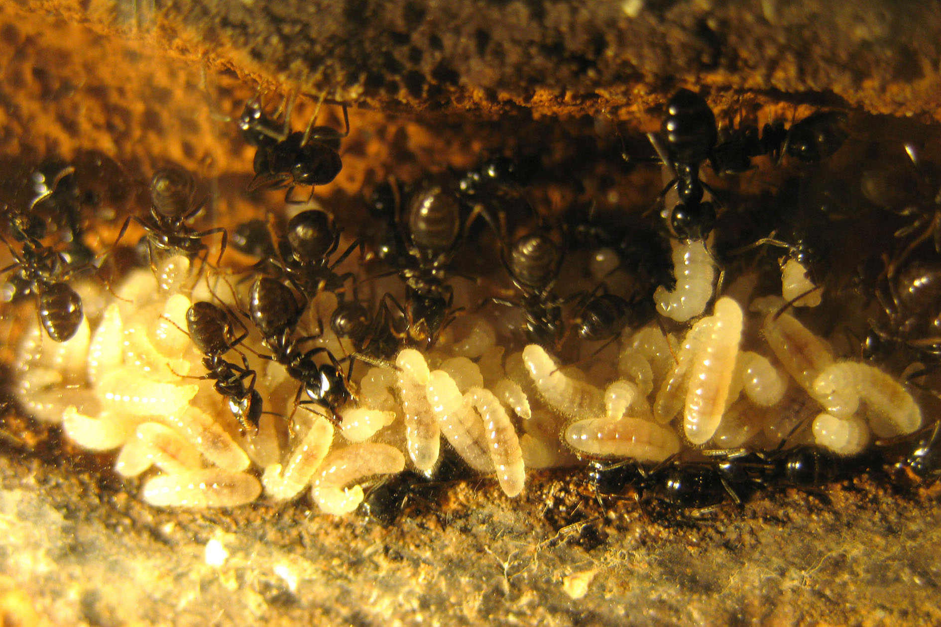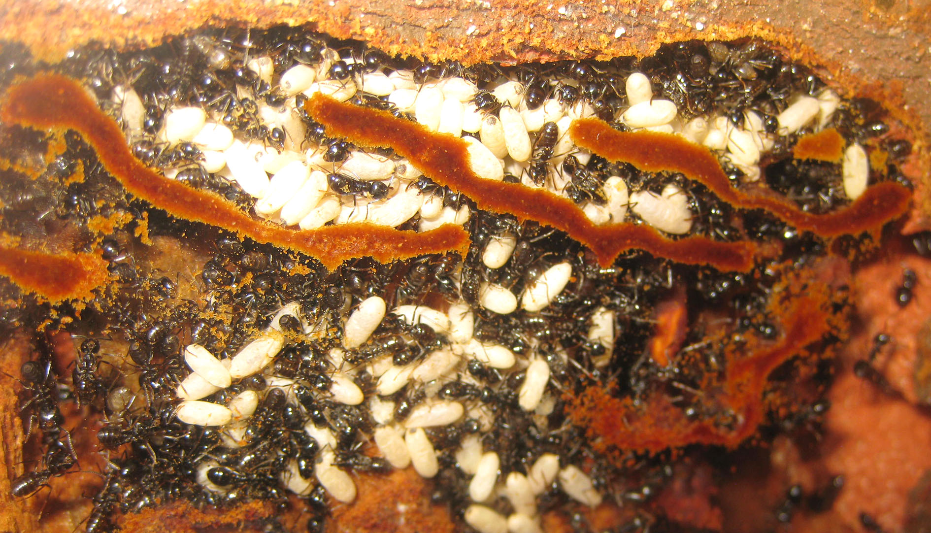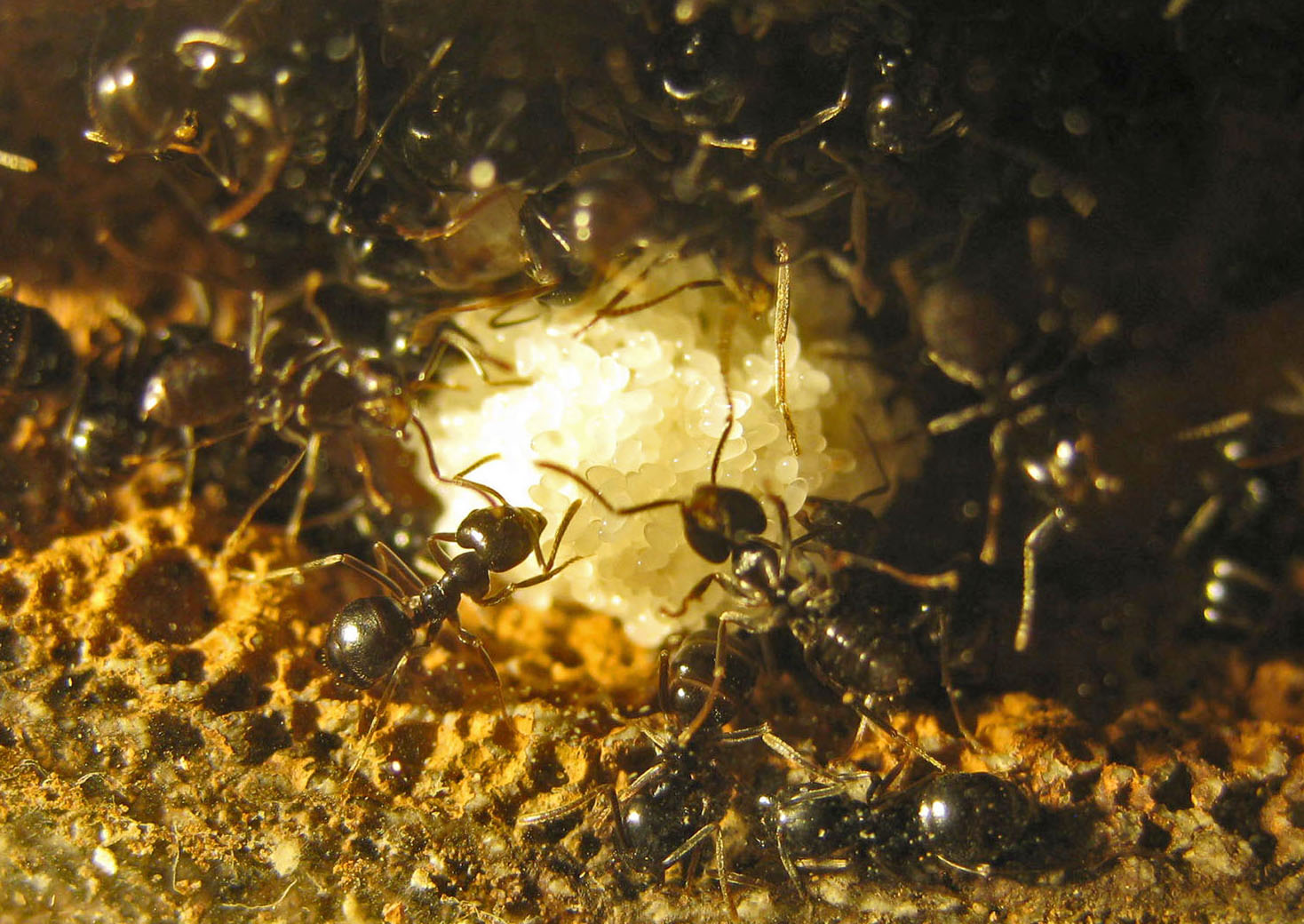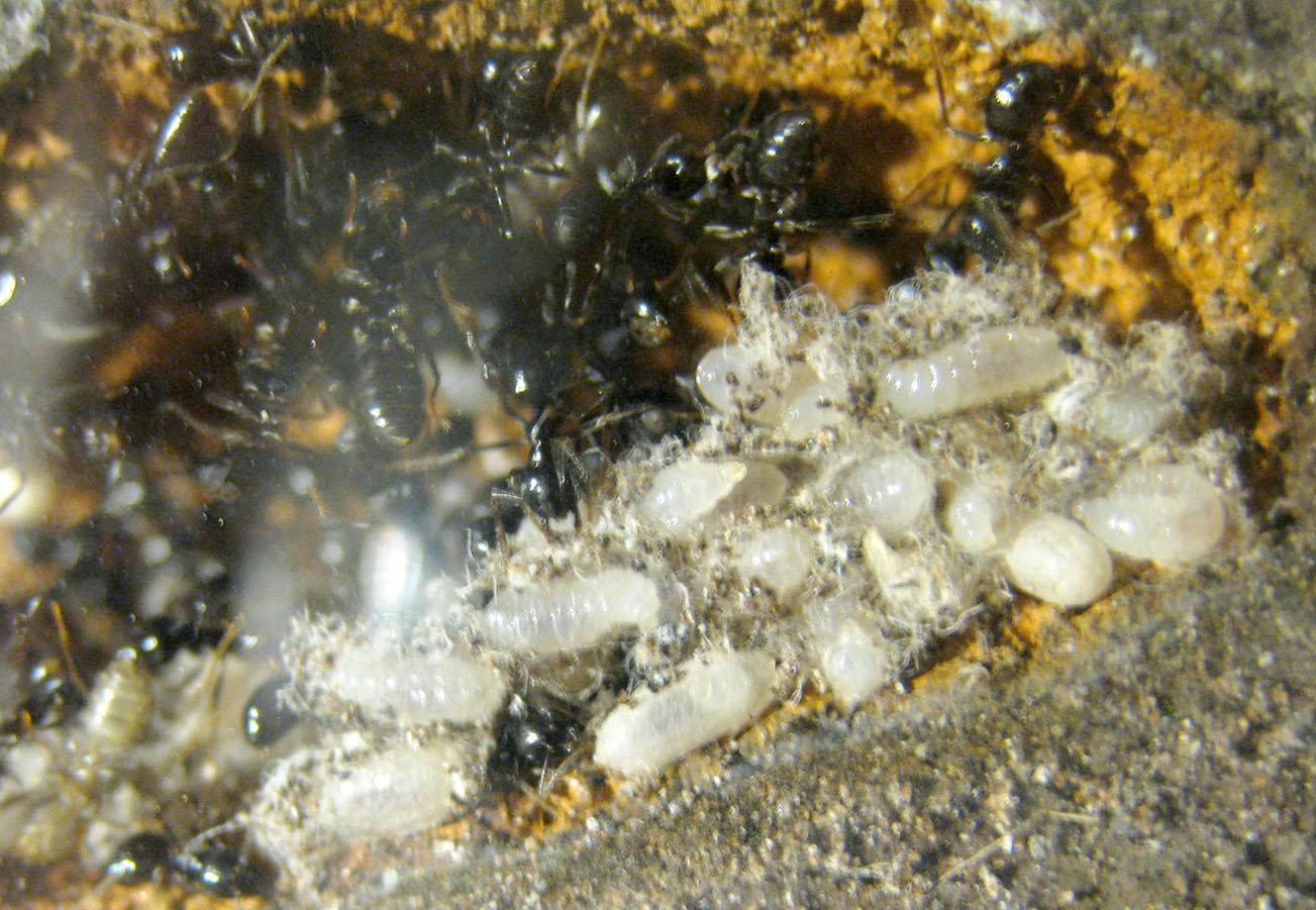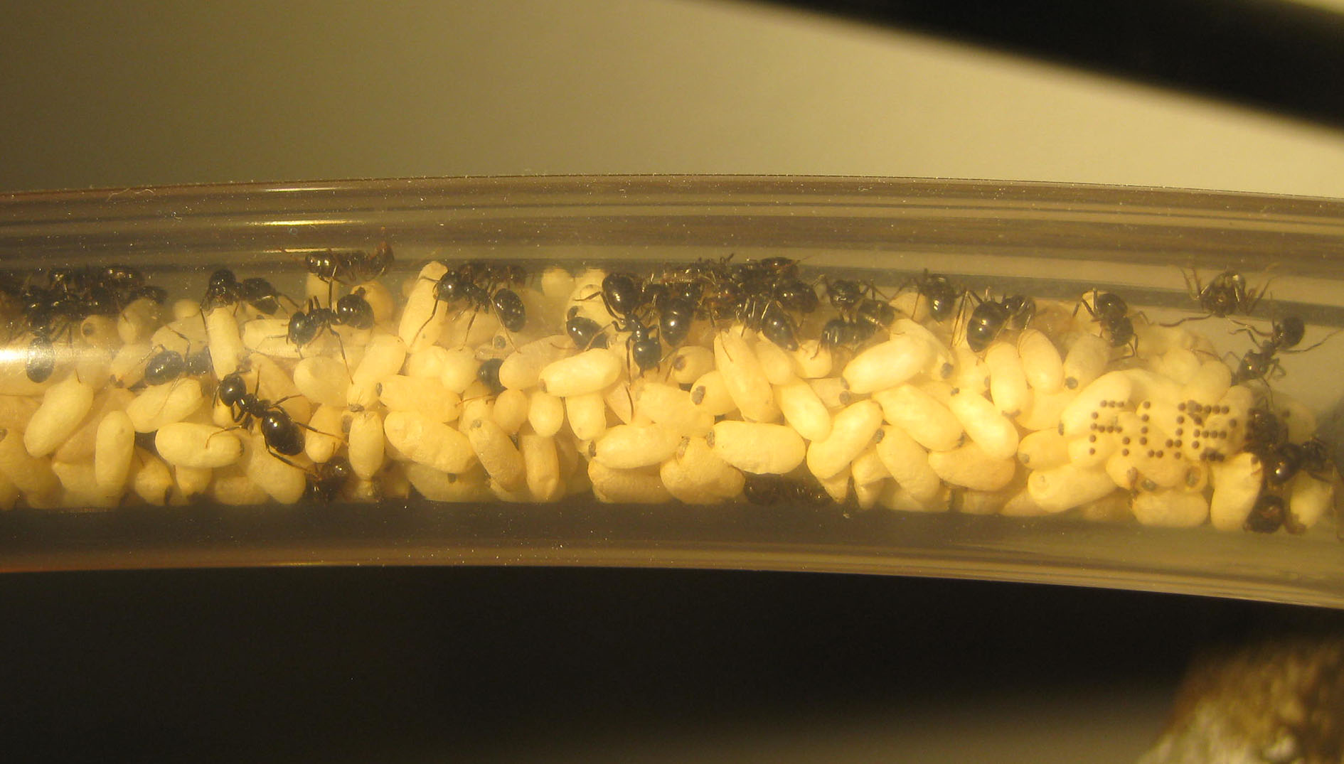 Due Giornate con Api e Formiche a Milano. In questa occasione, oberato da troppe colonie da accudire, yuri mi passa la sua colonia, in un nido in gasbeton 25 x15, verticale, faccia singola. È già evidente che prima di fine anno andranno trasferite, perché la covata presente è notevole, e per fortuna che le formiche sono piccole! La prima cosa che salta all’occhio è proprio il perfetto ordine in cui le operaie gestiscono gli stadi di crescita della covata: stanza della regina, delle uova, uova appena schiuse, larve piccole, larve medie, bozzoli… tutto ben separato, ben gestito. Le formiche lucide sono indaffaratissime e sembrano instancabili.