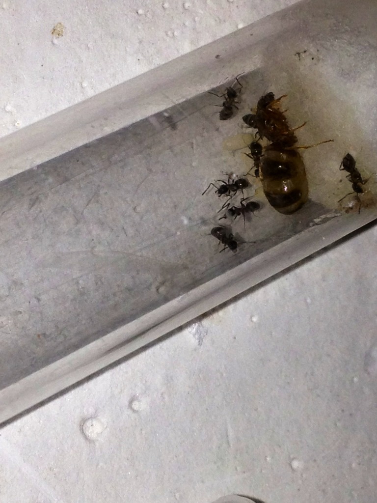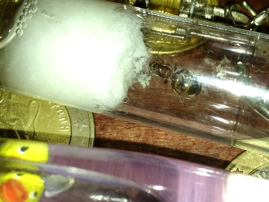 Ho già offerto loro del miele misto ad acqua e un insettino. La provetta è ora aperta in una piccola arena, speriamo che si ambientino in fretta!