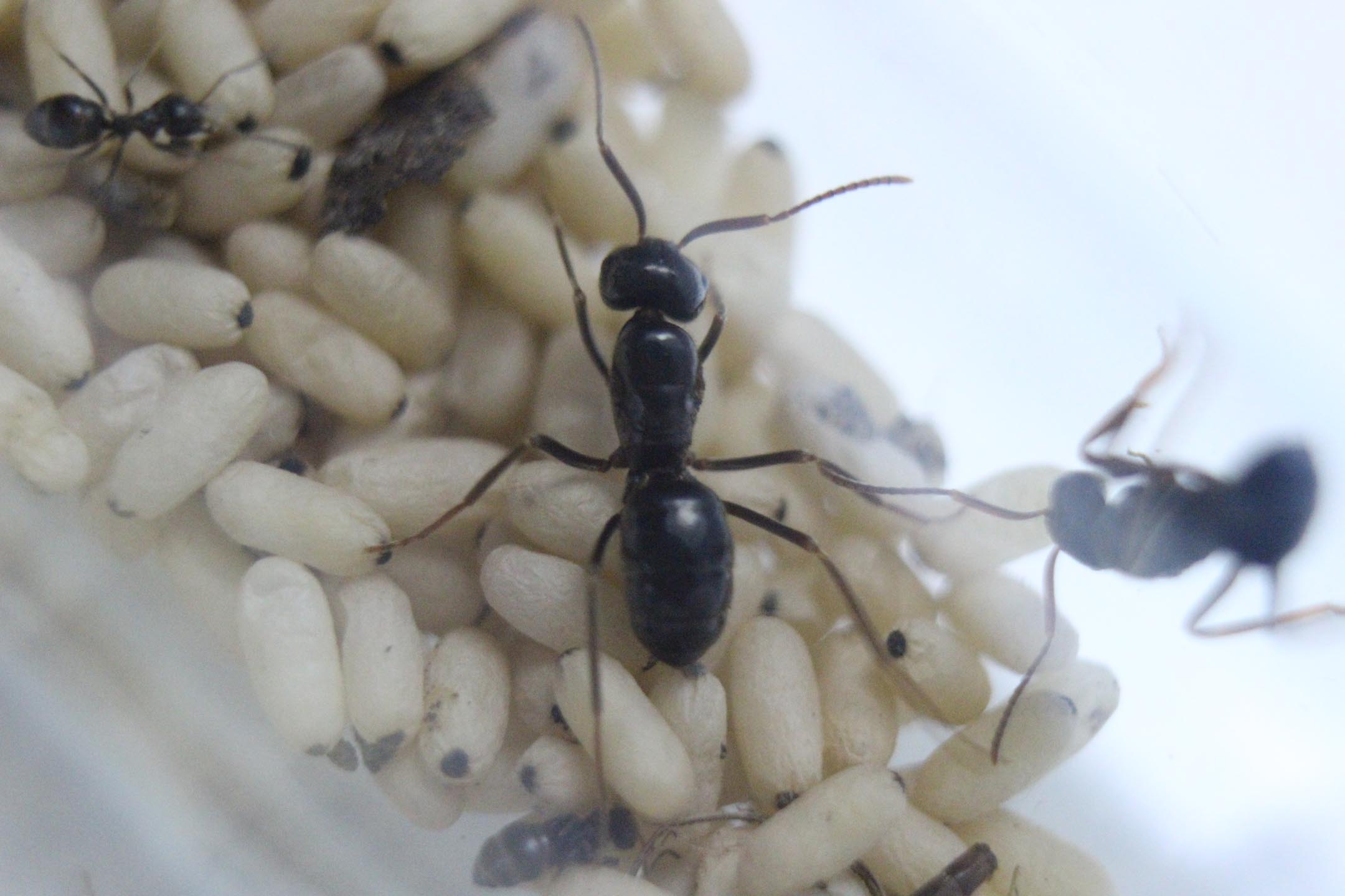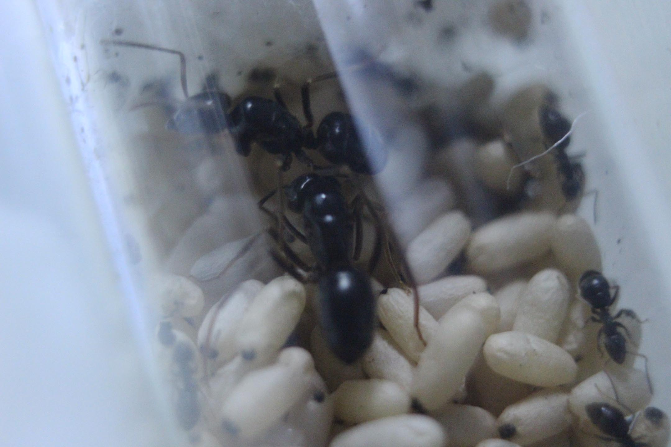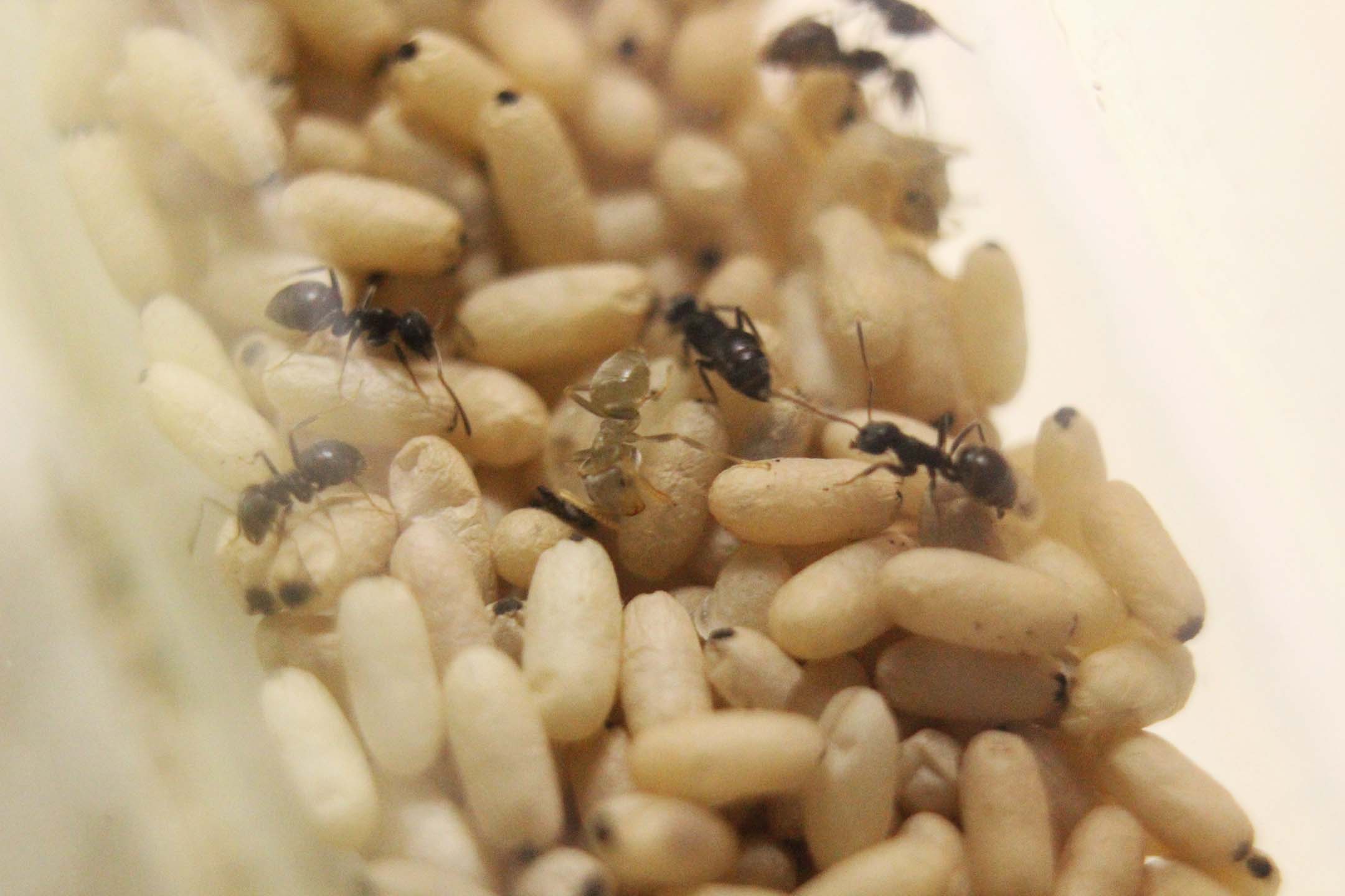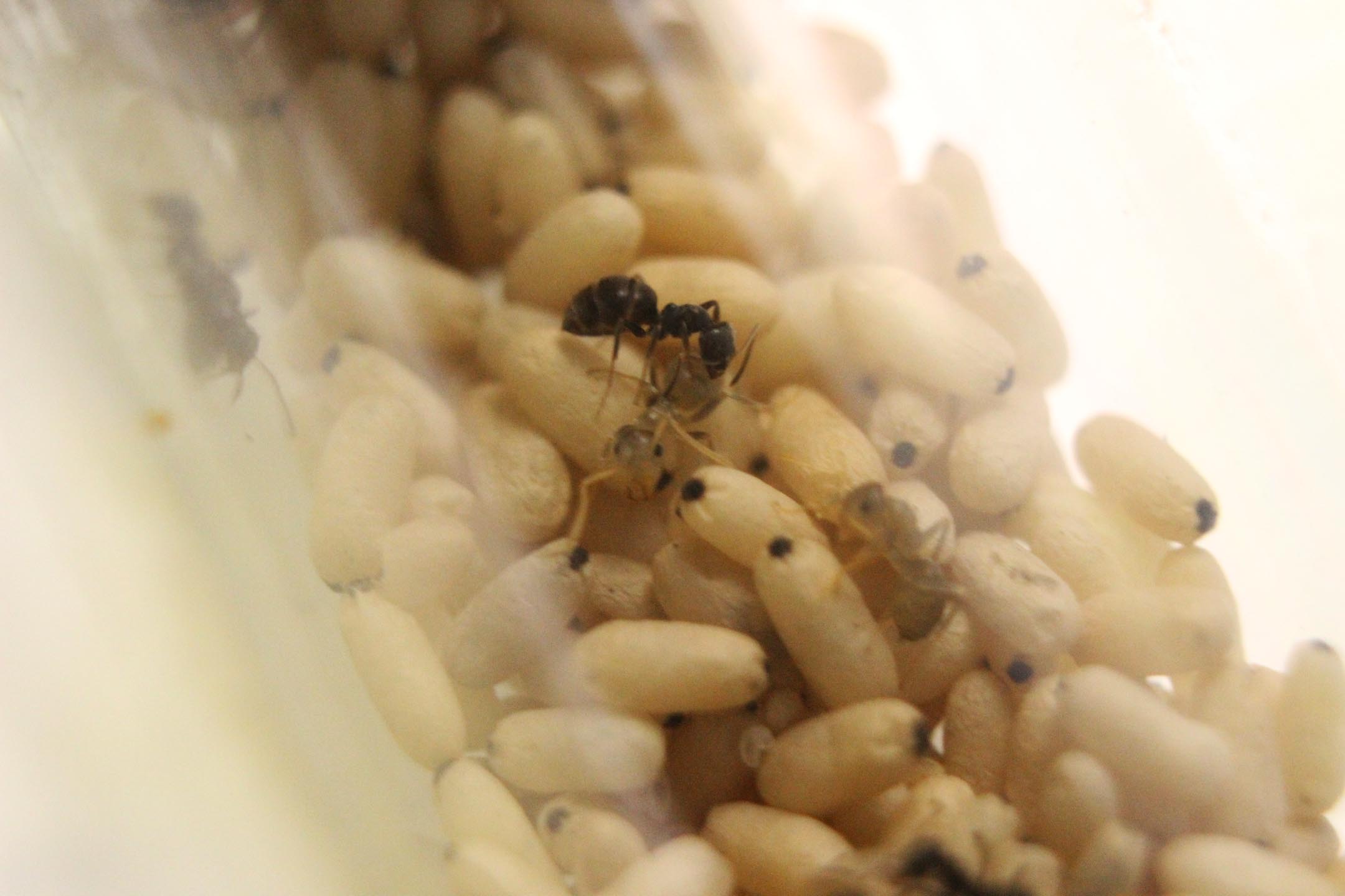 Le larve vengono costantemente curate da un manipolo di 50 operaie circa di Lasius niger. La colonia mangia in abbondanza e l'addome delle operaie è ben dilatato. Quindi credo che non ci saranno problemi, questa volta.