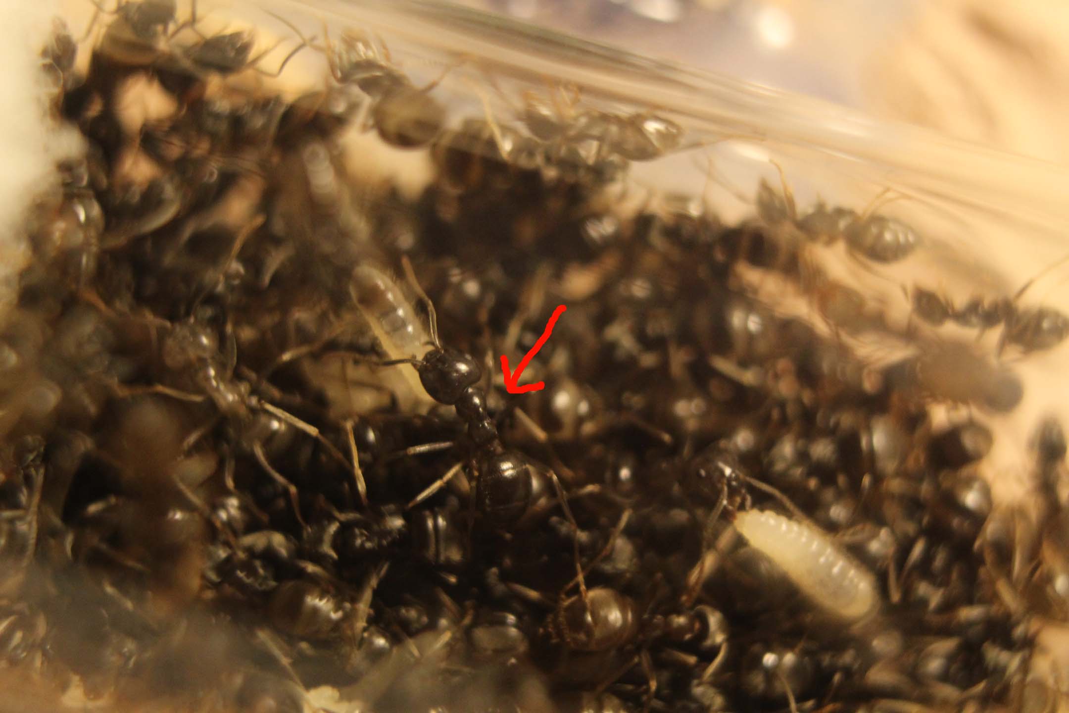 (Qui, indicata dalla freccia rossa, l'operaia che gira con la larva in bocca. La testa, sebbene sia più grande delle altre operaie, non è molto a cuore...almeno rispetto a quelle che si vedono in natura. Forse sempre per il fatto che è di prima generazione....)