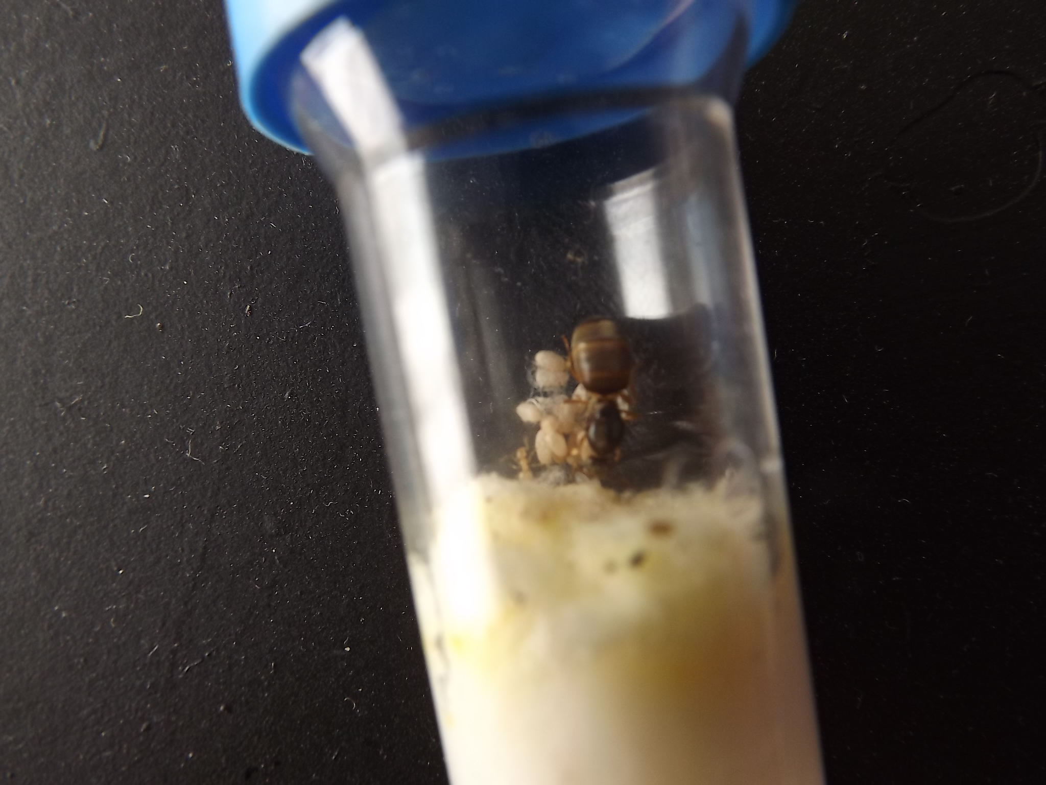 La neonata colonia conta per ora 4 operaie,12 bozzoli,15 larve con varie dimensioni e una decina di uova.Sembra procedere speditamente dimostrando la velocità di questa specie a crescere di numero.Tendono a ignorare il miele e fonti proteiche,mentre sono ghiotte di zucchero.Le operaie sono molto piccole,sui 3 mm max e quasi invisibili appena sfarfallate.Impiegano parecchi giorni a pigmentare completamente,passando da un bianco facilmente confondibile con i bozzoli,ad un giallo molto chiaro,anche se il capo risulta più scuro.Sono operaie particolarmente indaffarate e veloci,spesso si nascondono tra i mucchi di bozzoli per uscire dall'altra parte.Dimostrano molta forza,riuscendo a spostare gruppi di bozzoli in una sola volta.