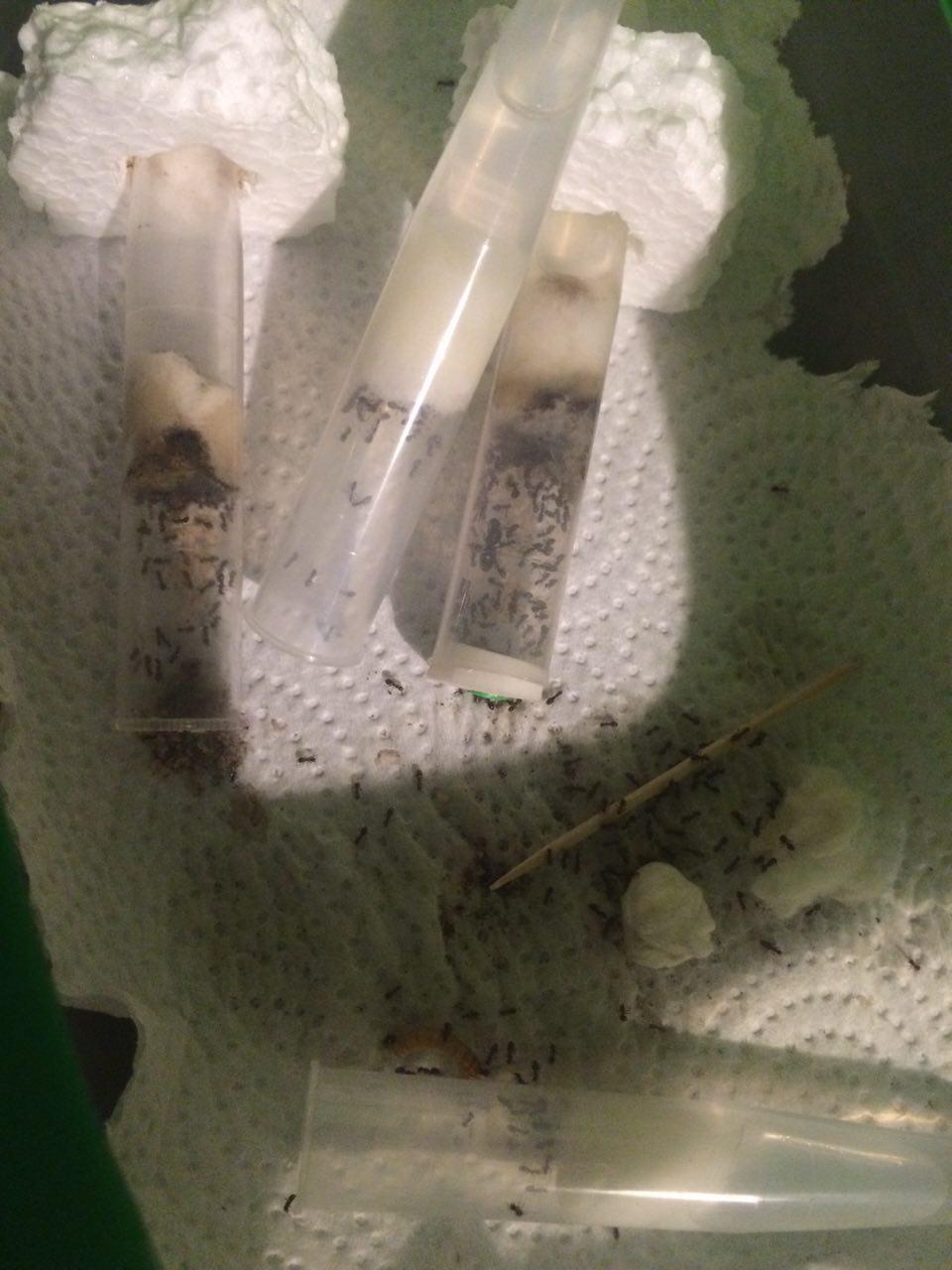 In questi mesi la loro attività è stata molto molto limitata ma da un mese a questa parte si sono svegliate e hanno iniziato a sfornare diverse uova, nello stesso momento era anche finita l'acqua nella provetta originaria lasciando 2 delle 3 regine da sole nella provetta vuota e sprovvista di acqua e trasferendo regina, operaie, uova e larve in quella nuova.