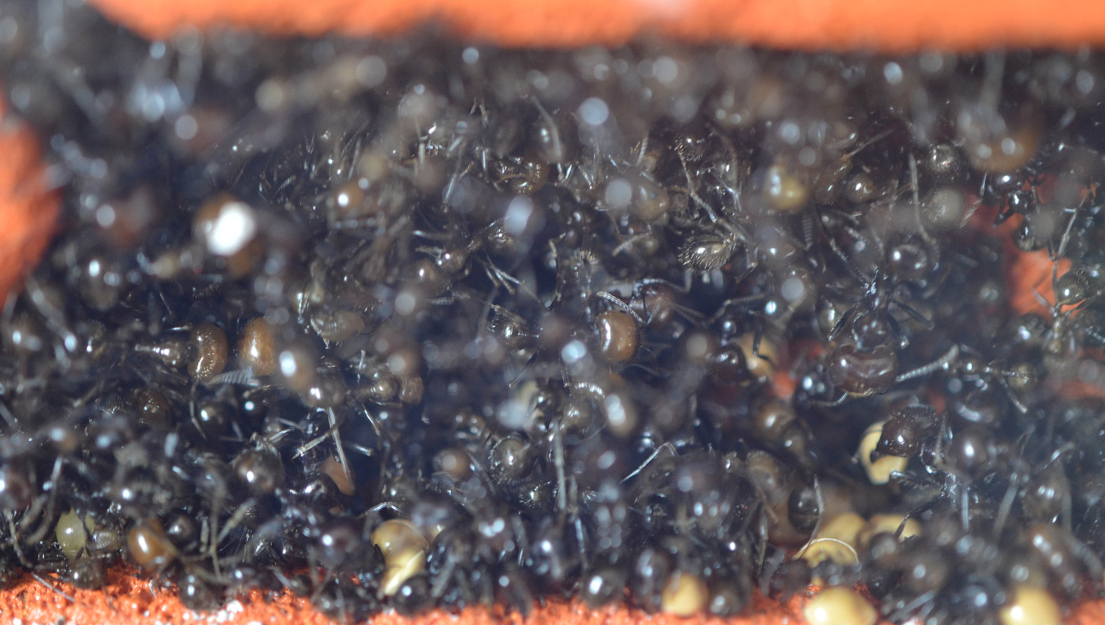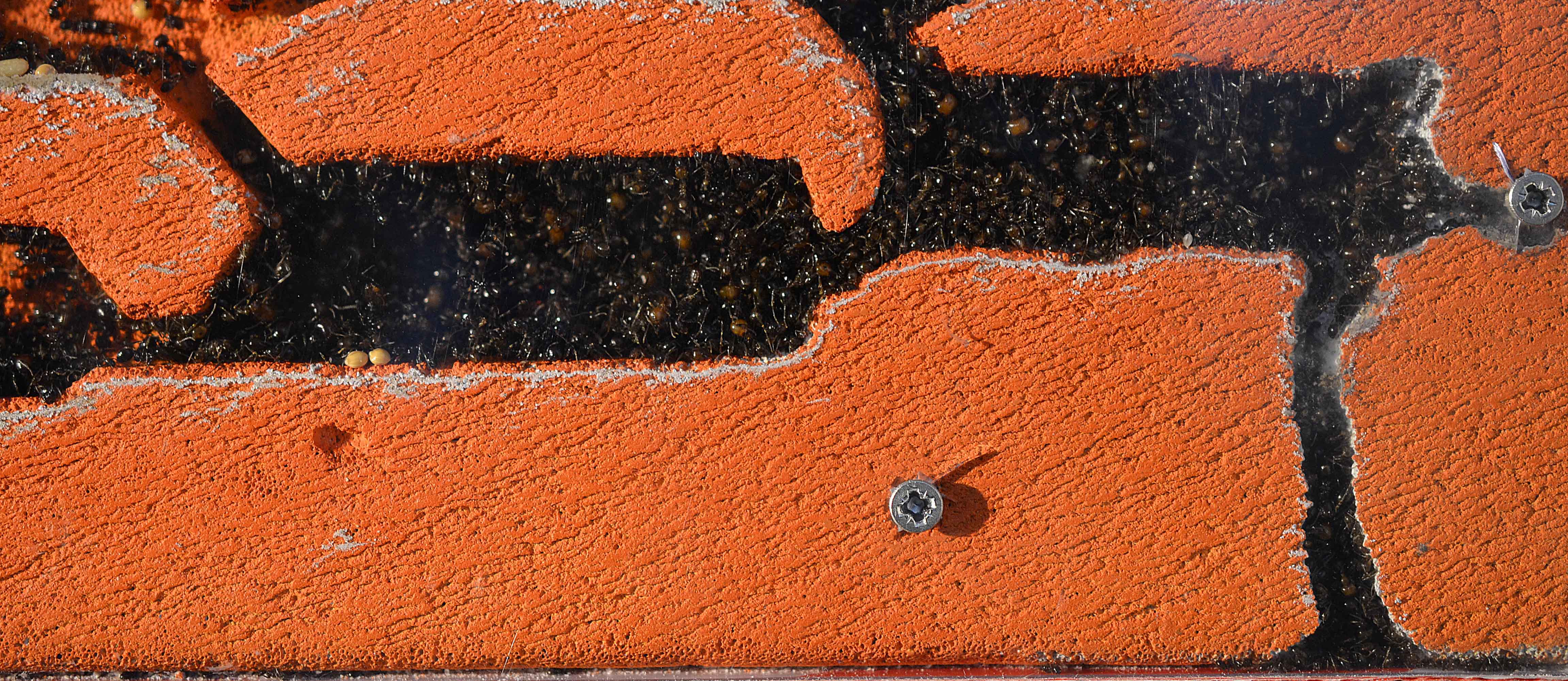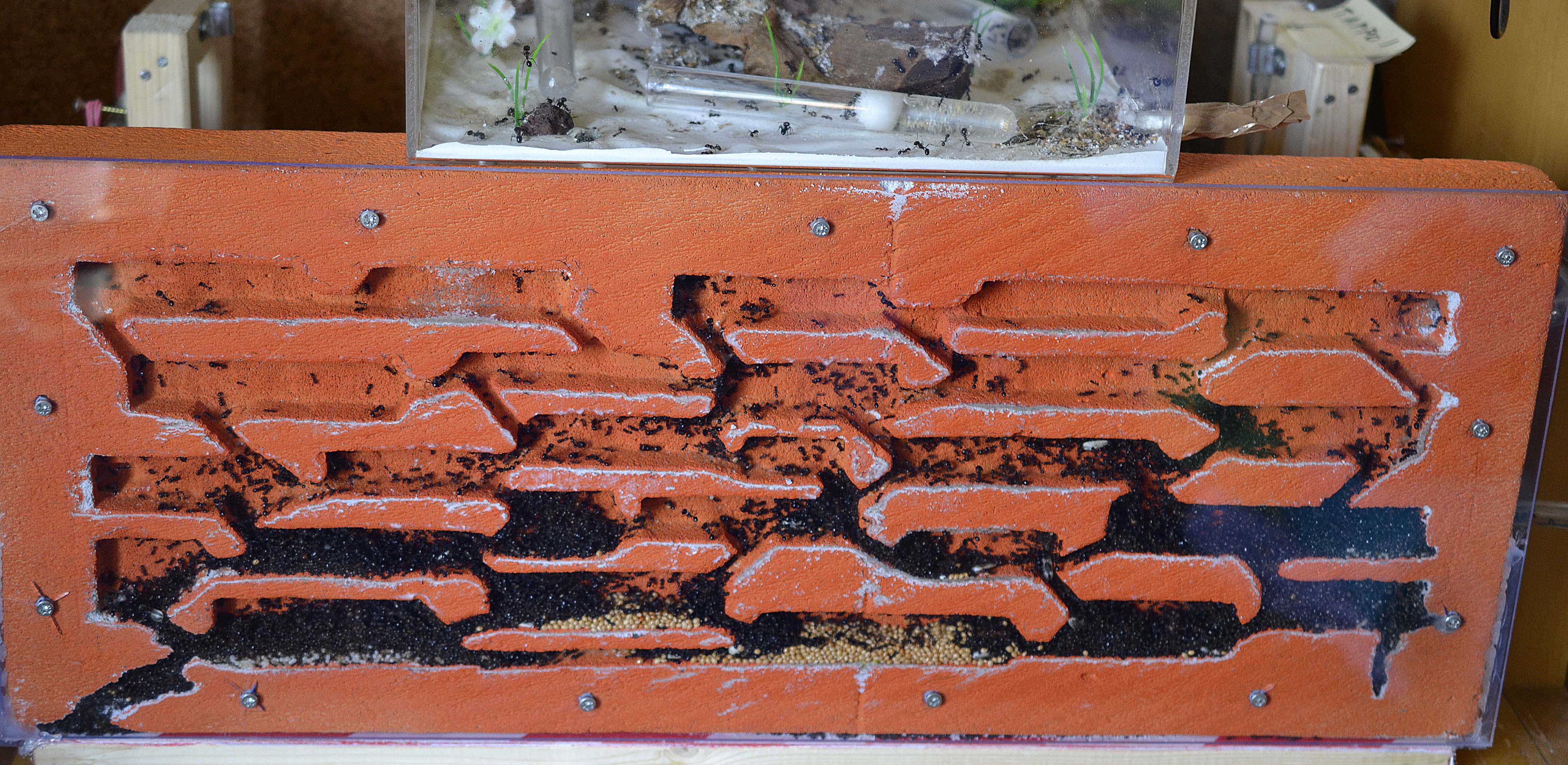 In questo periodo le operaie hanno continuato a scavare nell'angolo in basso a sinistra fino a raggiungere la base del nido. Una serie di listelli di plexiglass ha arginato le esploratrici e la situazione sembra essersi stabilizzata (tengo comunque monitorata la situazione).