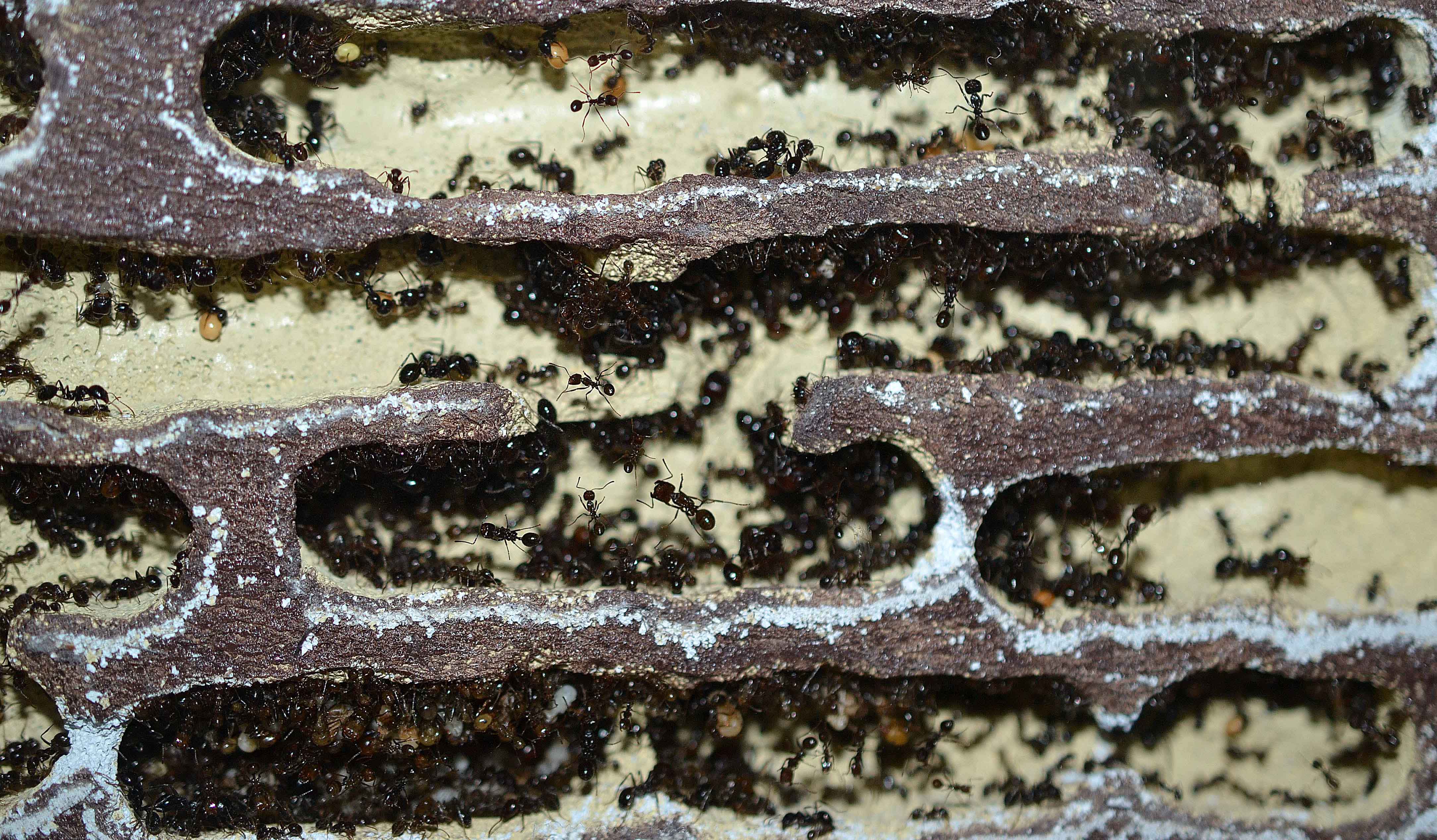 Ho quindi ultimato i preparativi collegando subito dopo i due nidi tramite un tubo che attraversa il vetro e si collega al blocco interno. Nel giro di pochi minuti già decine di operaie stavano esplorando la nuova area iniziando ad interessarsi a quelle parti del nido che le 'invitano' a scavare. Questa volta però possono fare come preferiscono, tanto alla peggio si ritroveranno in arena