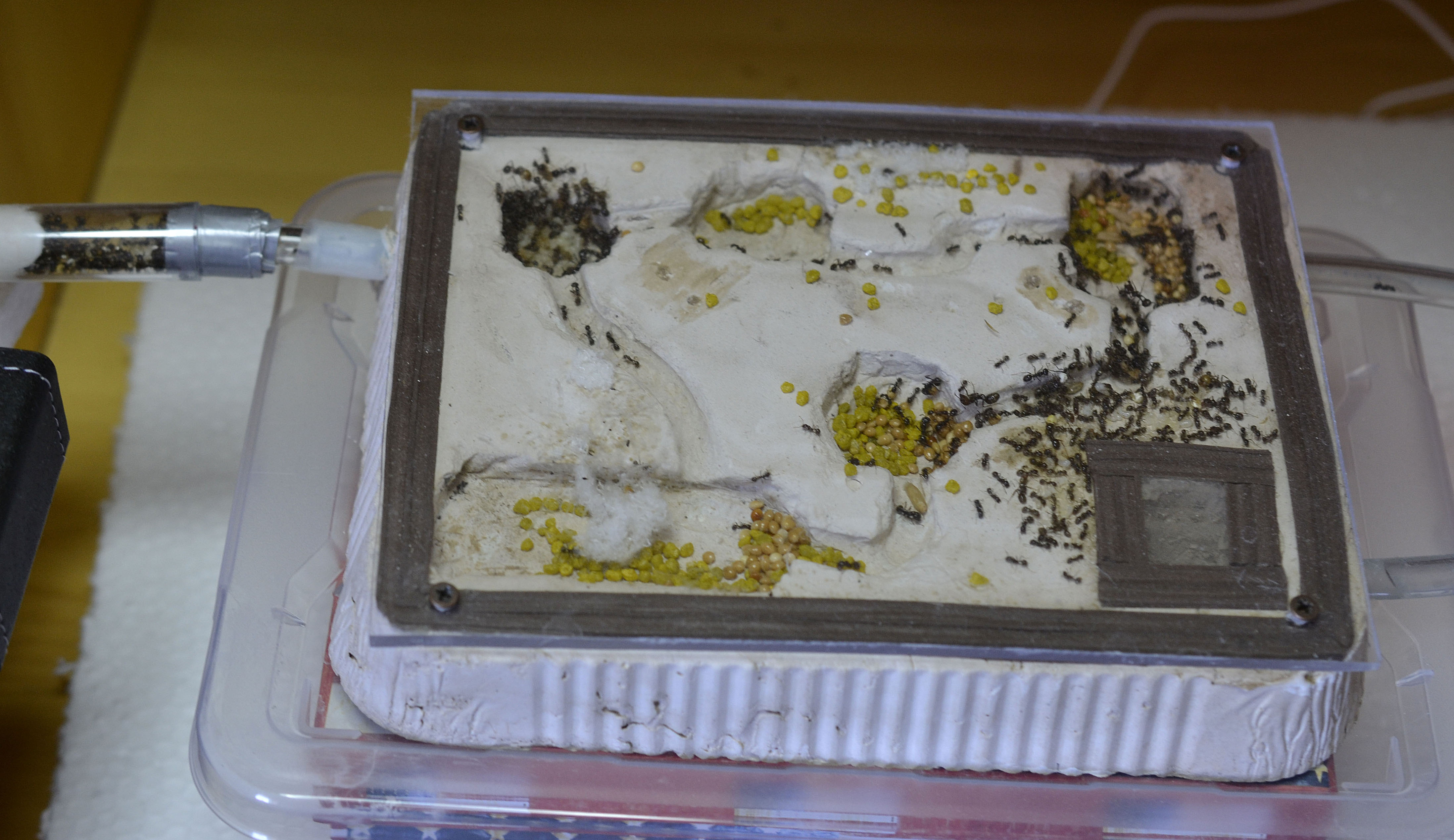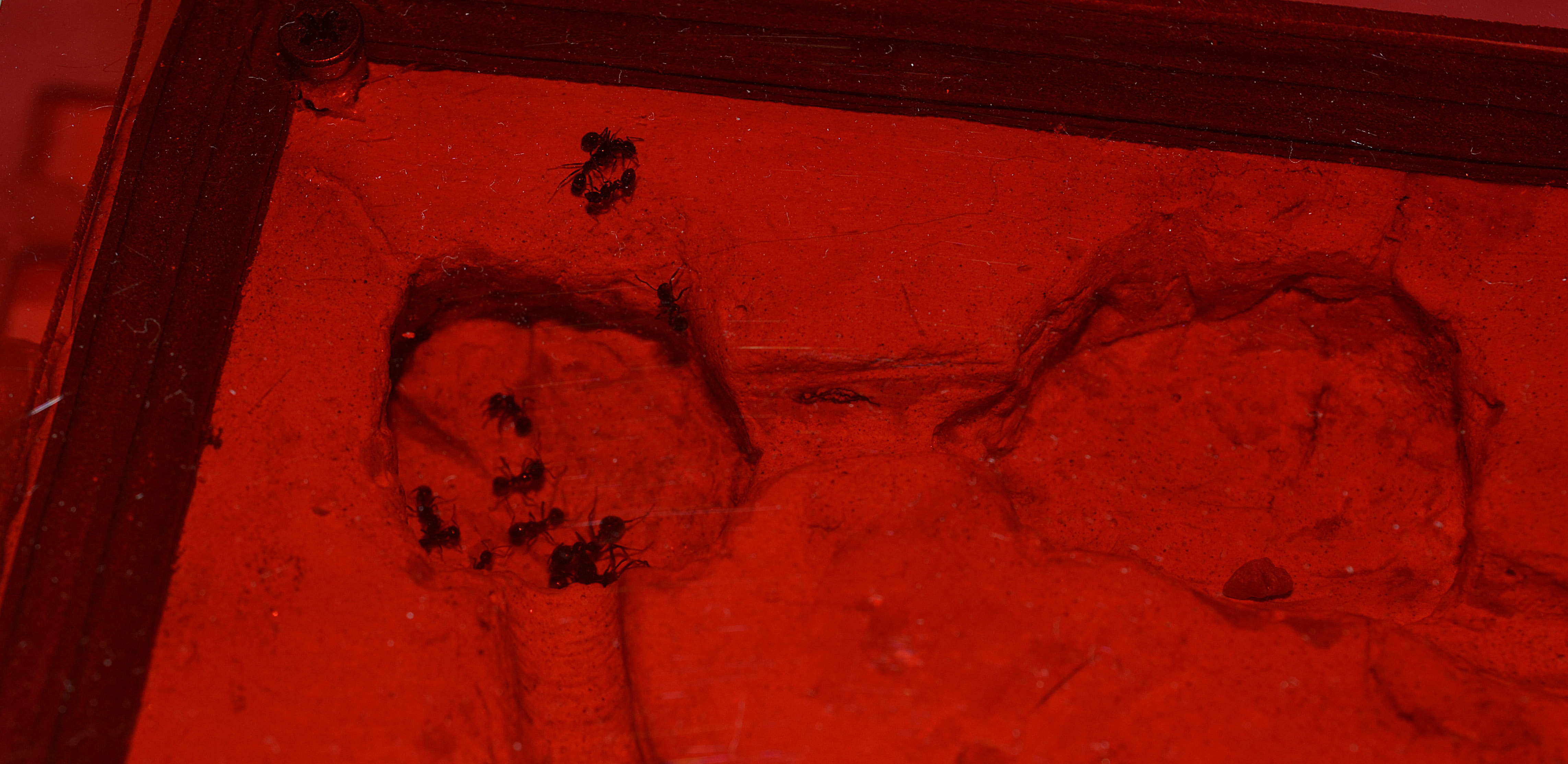 Aggiornamento della colonia dopo qualche giorno dal trasferimento. Tutto sembrerebbe procedere per il meglio. Ogni stanza del formicaio è (bene o male) occupata, compresa la provetta del serbatoio che viene spesso riempita con larve e pupe. Tolta la pellicola rossa utilizzata per il trasloco, la colonia non ha dato segni di stress. Una sera la regina si è comportata in maniera 'particolare' (mai vista fare così finora), portandosi all'interno del tubo di collegamento (attraversando tutte le stanze del formicaio), praticamente fino al foro dell'arena, per poi rigurgitare una goccia di cibo liquido (voracemente assalita dalle piccole operaie non ancora del tutto pigmentate che la seguivano) e tornarsene all'interno del nido.