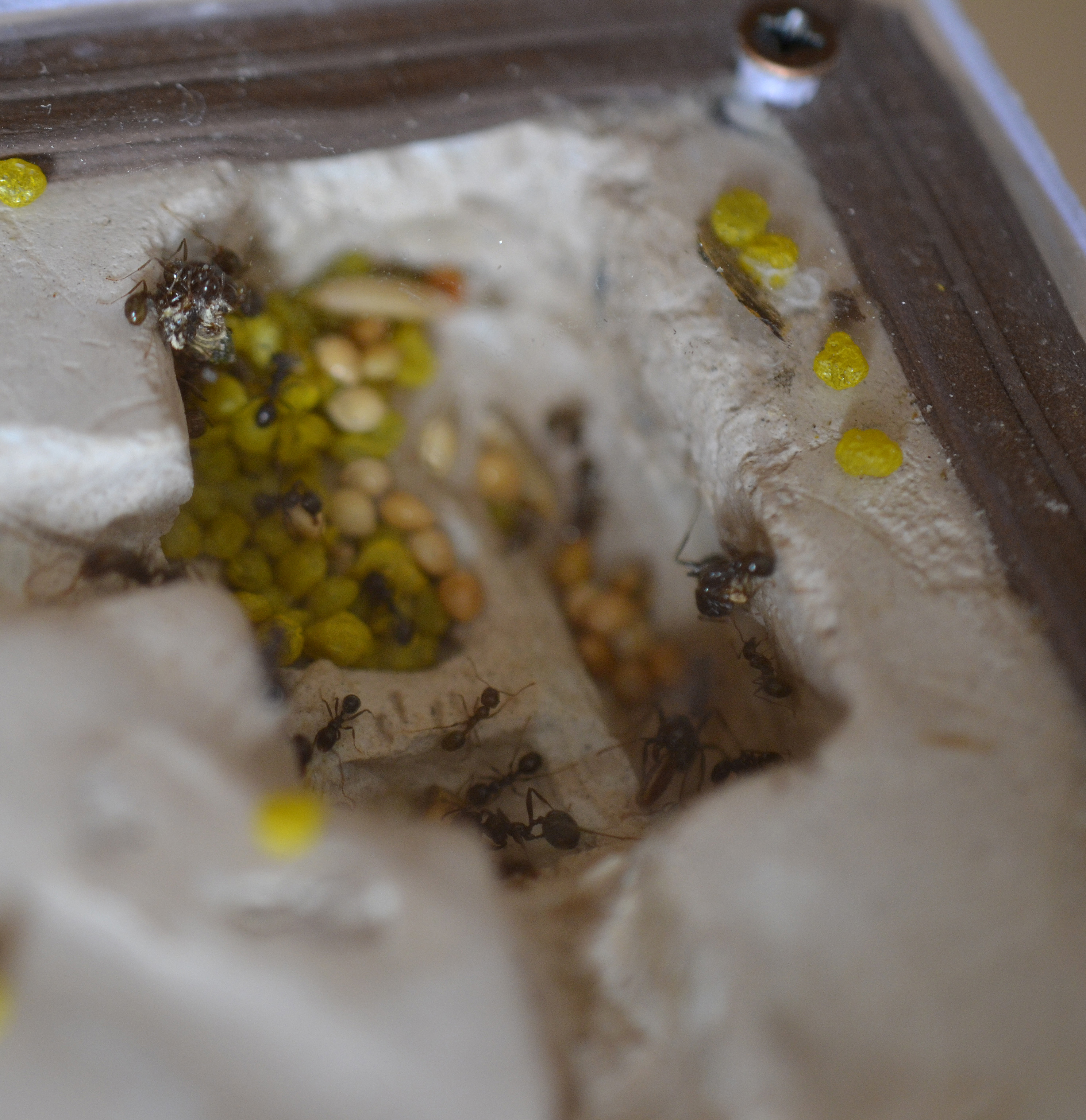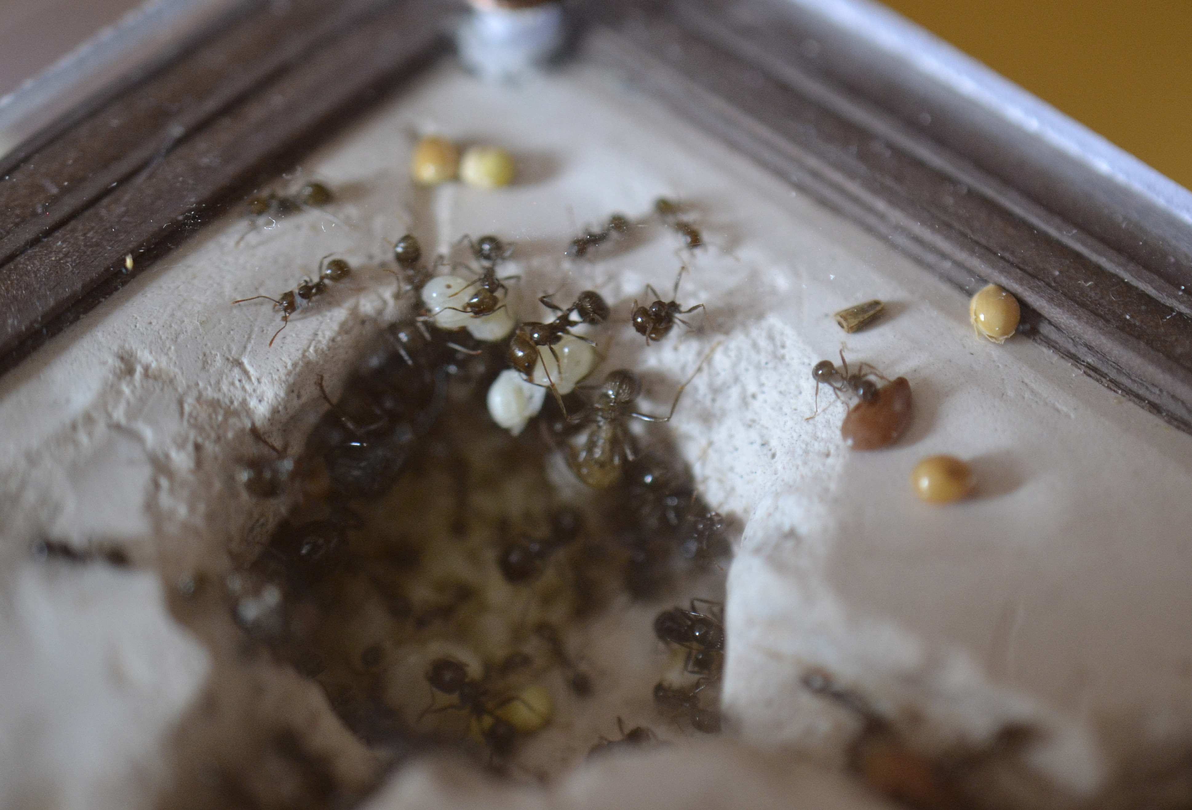 Le formiche hanno inizialmente occupato 2-3 stanze, una per la covata e le altre due per immagazzinare i vari semi. Stamattina però, ho notato che anche le altre sono state utilizzate, (di quest'ultime) soprattutto la più grande in basso a sinistra, dove hanno portato alcuni dei semi già introdotti nel nido (probabilmente in quanto è una delle stanze più secche).