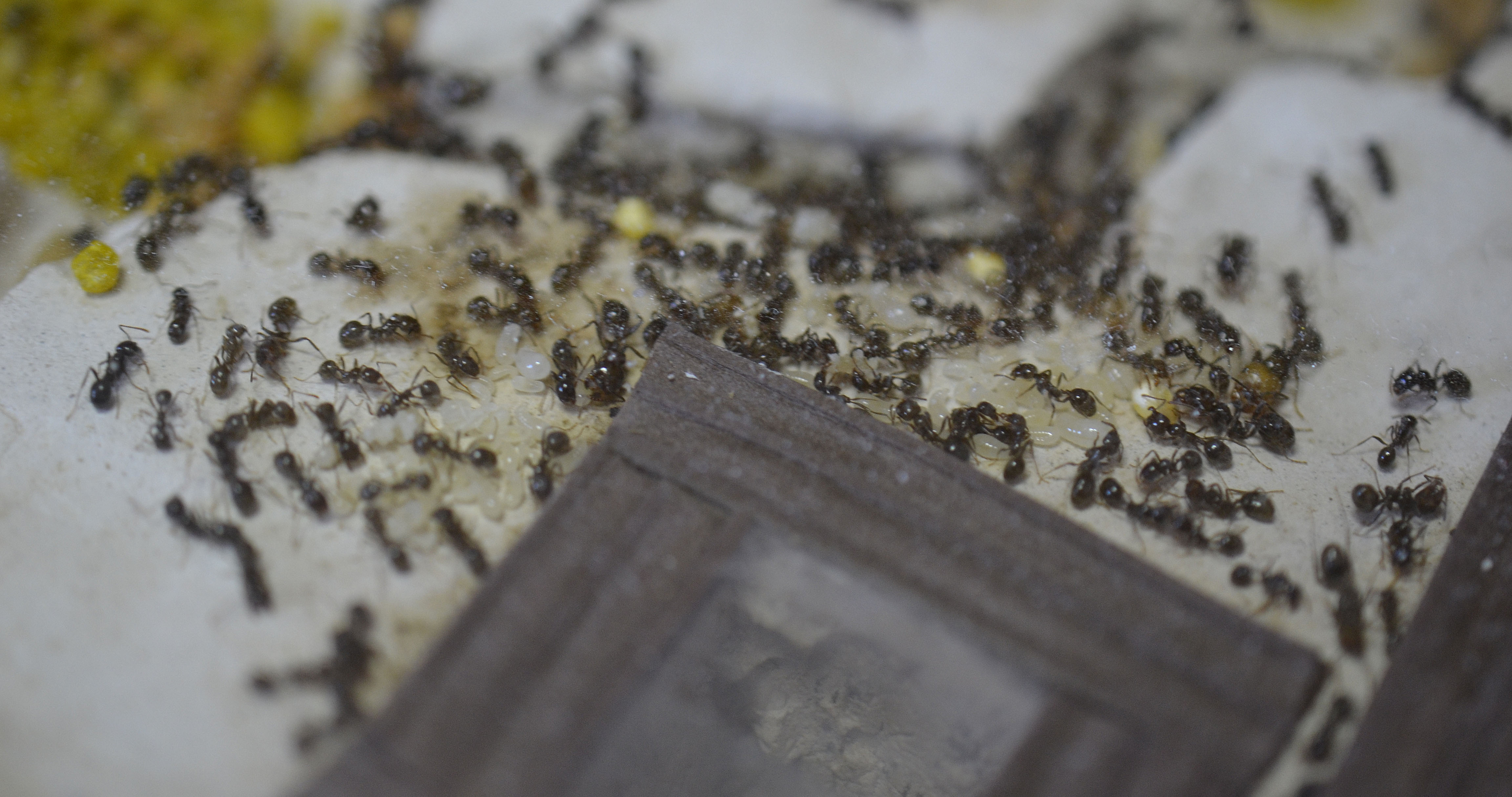 Al contrario delle C. scutellaris accettano ancora proteine (ed anche semi), dimostrando che la regina non ha smesso di deporre e che la colonia sta ancora curando la covata ( ho appunto notato nuove deposizioni in una camera del nido) .