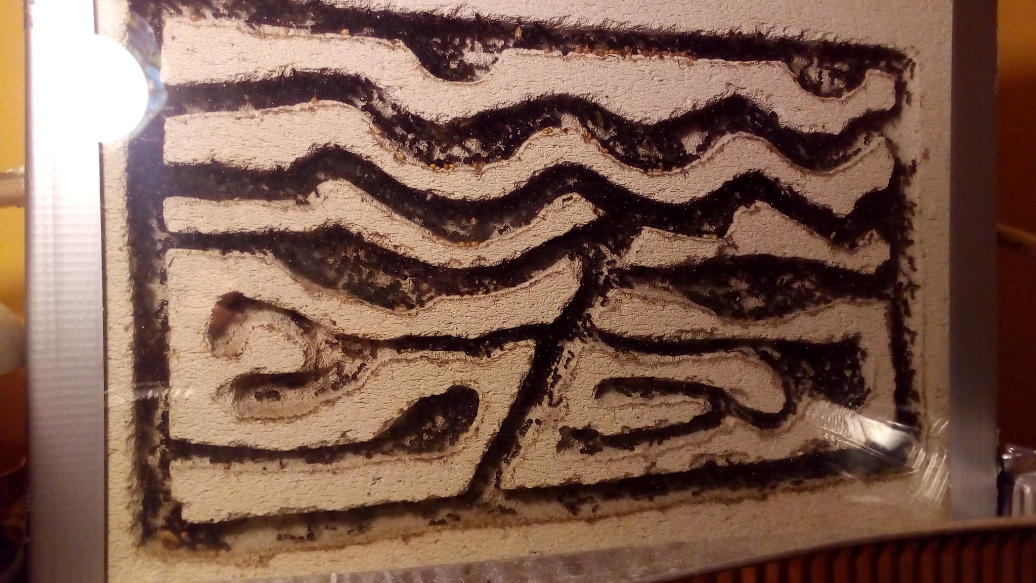 In ogni caso come ho quasi sempre fatto nei miei formicai, non amo sigillare le parti superiore ed inferiore quindi quando aggiungo acqua, questa per capillarità fra gasbeton e vetro, raggiunge immediatamente il corridoio inferiore.