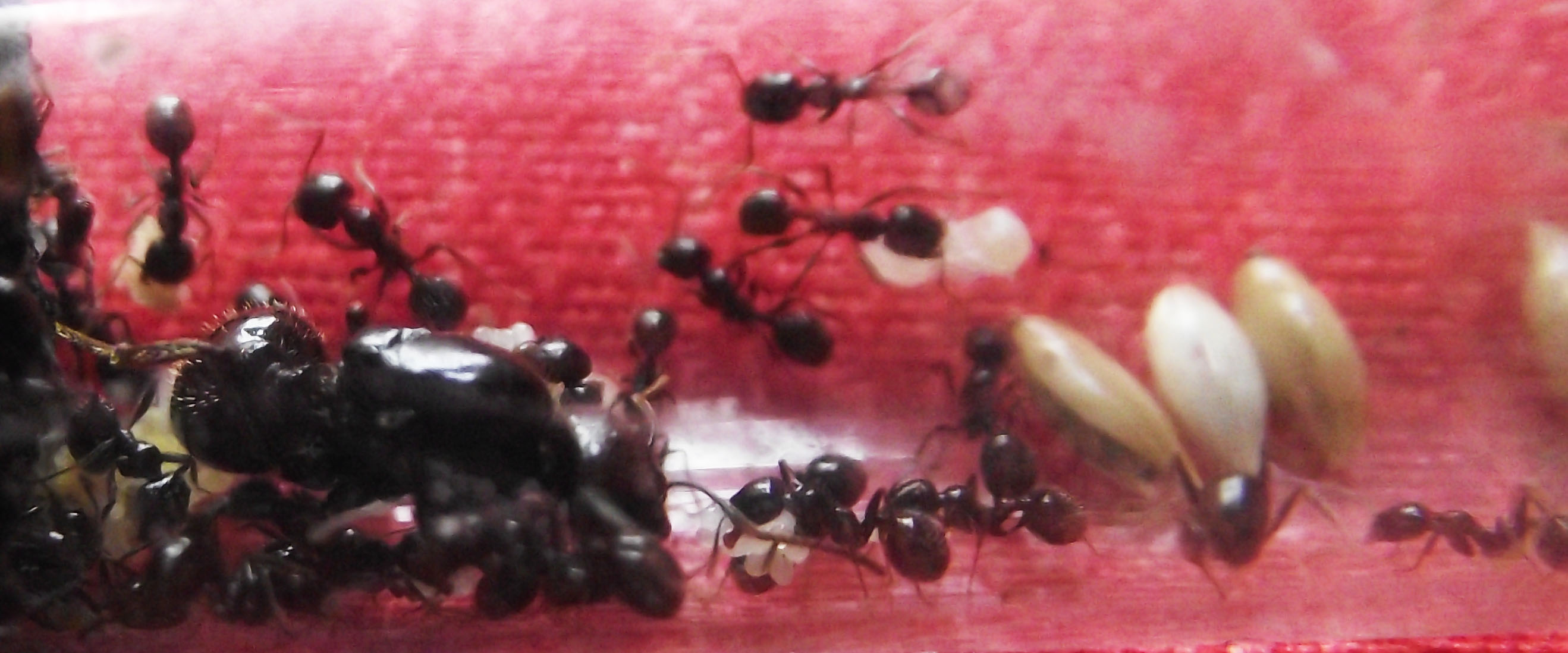 Come previsto ormai anche se all'esterno fa freddo in casa è abbastanza caldo da far risvegliare la colonia, le larve si sono impupate e mi sembra di poter dire che hanno nutrito abbastanza una larva per avere di nuovo una media nella colonia. Non accettano proteine per ora, ne camole ne pezzetti di carne, purtroppo non ci sono altri insetti per ora...Appena possibile provo con un pò di tuorlo d'uovo vedo se lo gradiscono. Non essendoci medie o major non riescono ad aprire i semi, la regina ormai non si occupa più di questo come faceva l'anno scorso, ho notato che non avevano "pane" e i semi rimanevano intatti e sempre dello stesso numero, ho provato a fornire un seme schiacciato, è stato subito portato dentro e lavorato, fino alla nascita della prossima operaia con un capo abbastanza grosso penso che dovrò aiutarle un poco, nei mix di semi non c'è una grande varietà in natura troverebbero sicuramente piccoli semi adatti a loro.
