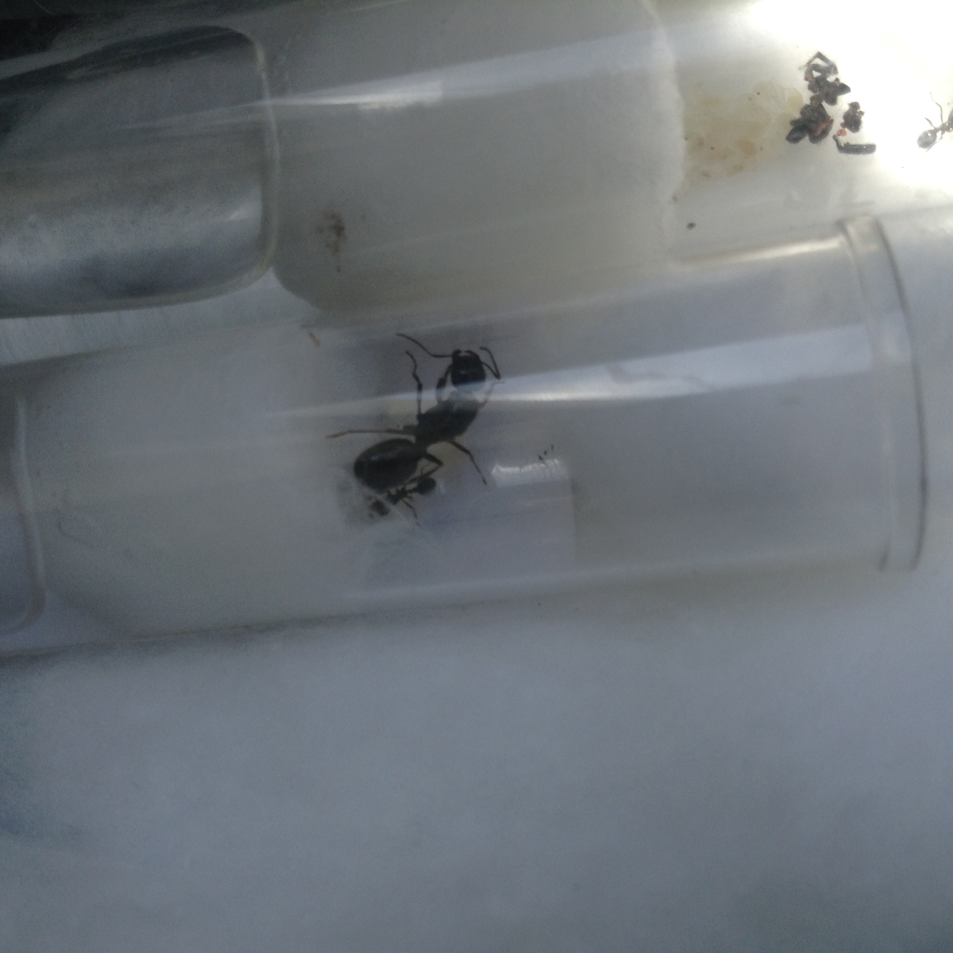 Stamattina dopo neanche un giorno dalla nascita dell'altra sorella è nata la 5 operaia e posso dire che dalla nascita della seconda figlia c'è stata circa una nascita al giorno! Iniziano a sembrarmi particolarmente curiose,oggi alla fornitura di una nuova zanzara (la precedente è stata spezzettata e divorata) le operaie si sono avvicinate con aria probabilmente molto curiosa all'apertura della provetta e una sembra sempre disposta all'entrata ad aspettare ogni mia possibile apertura! Per il momento è presto ancora per pensare all'arena ma pensando a come si stanno sviluppando in questi giorni direi che posso iniziare a pensare ad un idea per l'arena!
