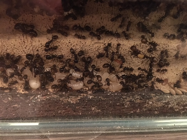 Da una settimana sto riscaldando leggermente una piccola superficie del vecchio nido: oggi ho potuto osservare i primi risultati: un pacchetto di uova fresche, segno che la cosa è stata registrata positivamente dalla regina. Conto di trasferire la colonia nella prossima settimana, anche perché il periodo di visita nelle scuole e nelle mostre entomologiche si sta avvicinando e il nido deve essere bello e sicuro per poter essere spostato e mostrato al pubblico.