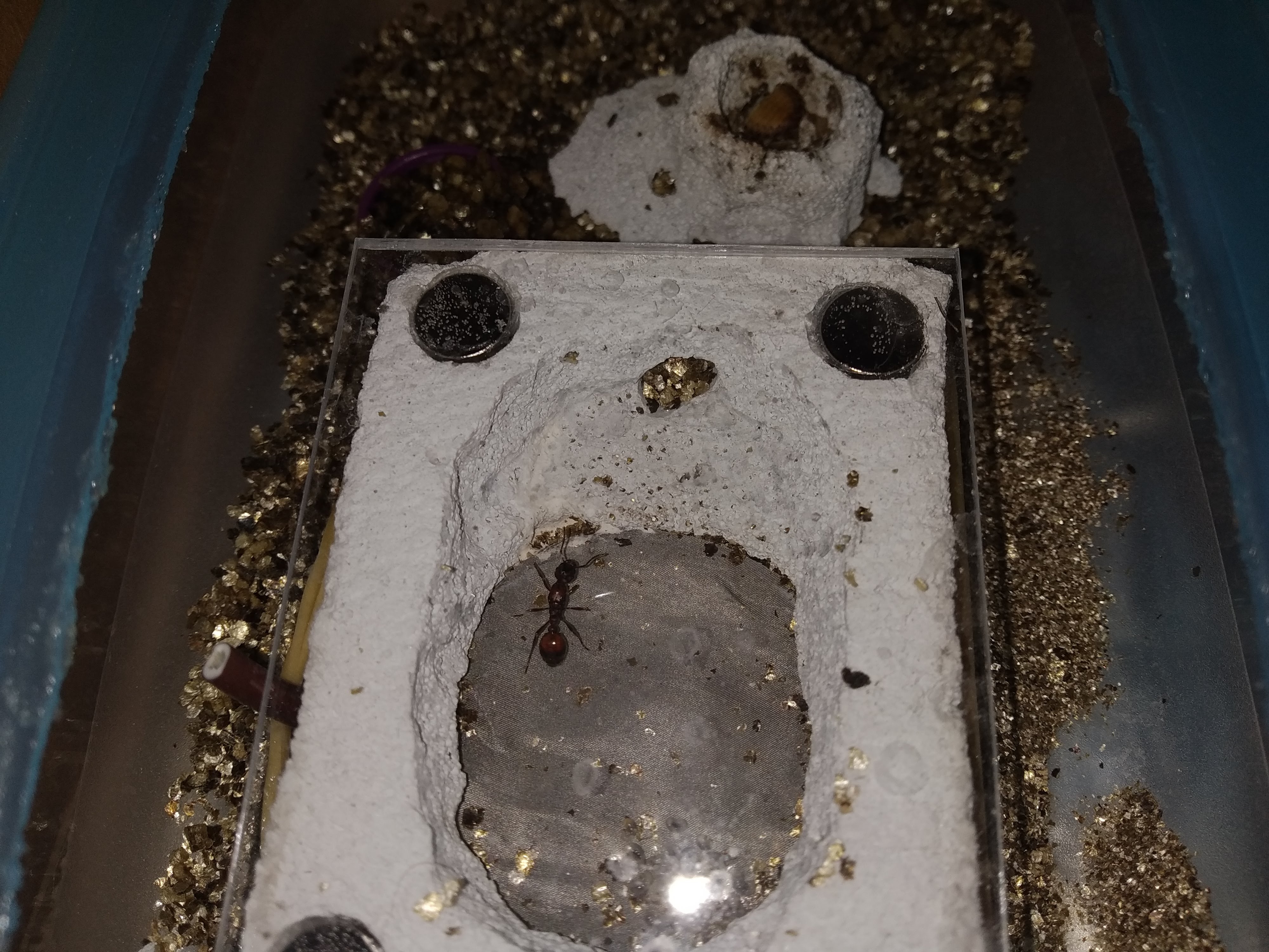 Trasferisco la regina Gamma dentro un formicaio con water tower e arena con substrato di vermiculite, la regina ha diverse uova, due larve e una pupa in fase di pigmentazione.