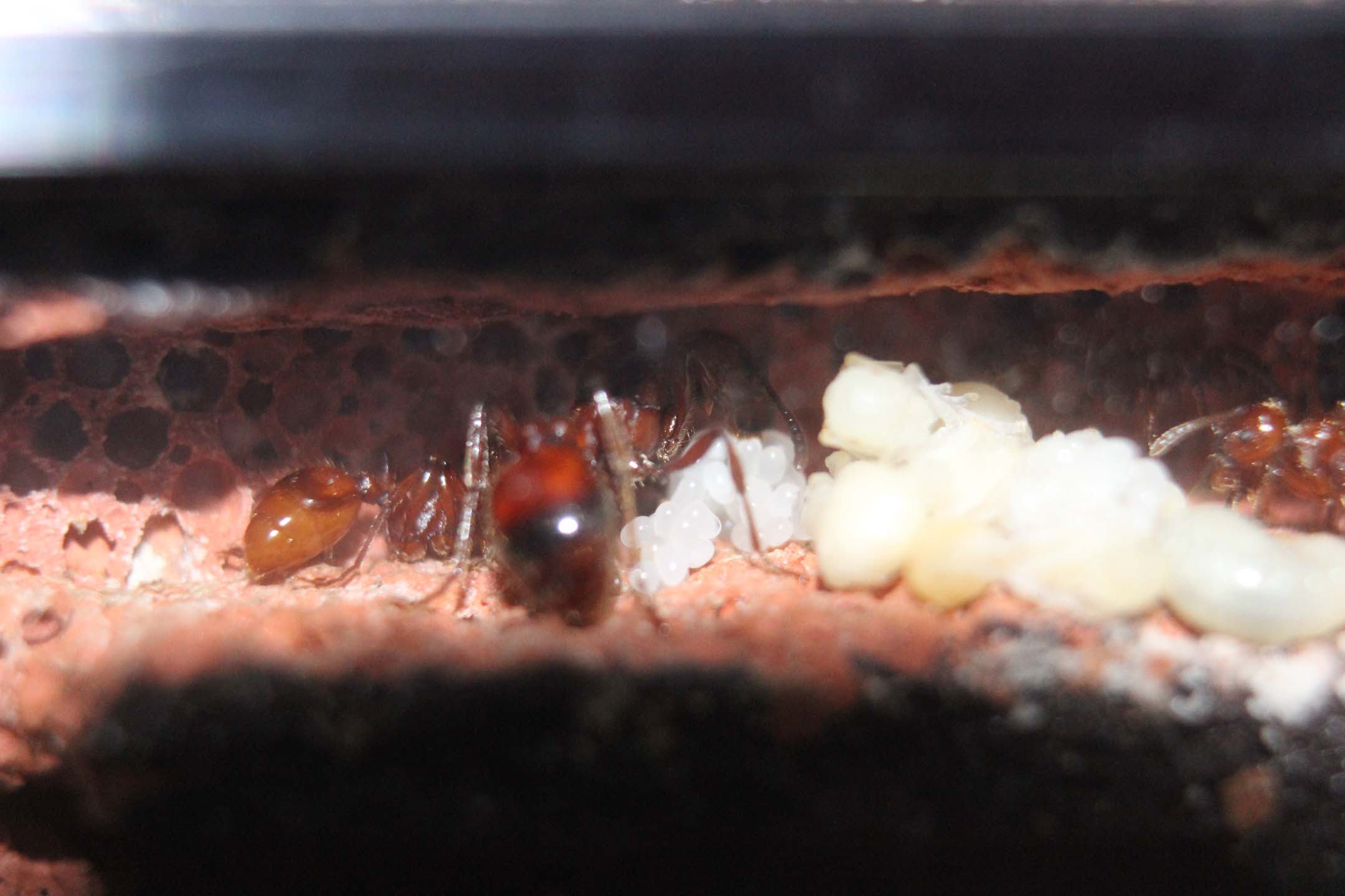 Da una decina di giorni, la colonia si è completamente risvegliata. In due settimane quasi tutte le larve residue dall'autunno si sono impupate e la regina ha ripreso a deporre (nonostante in casa ci siano 16-17 °C). Attualmente ci sono 3 grappoli da circa 15 uova ognuno. Le cure vengono eseguite sia dalla regina (che si occupa soprattutto delle uova), sia dalle operaie (ormai una decina).