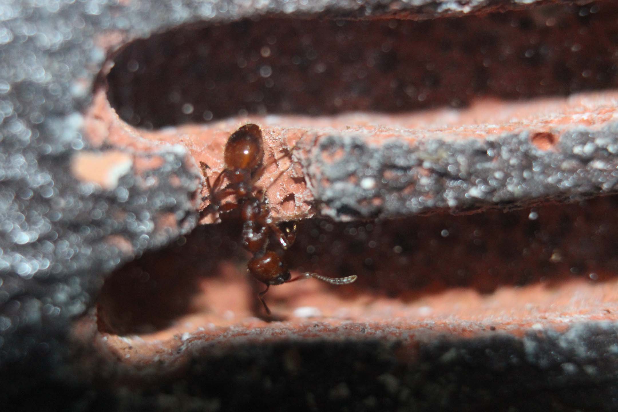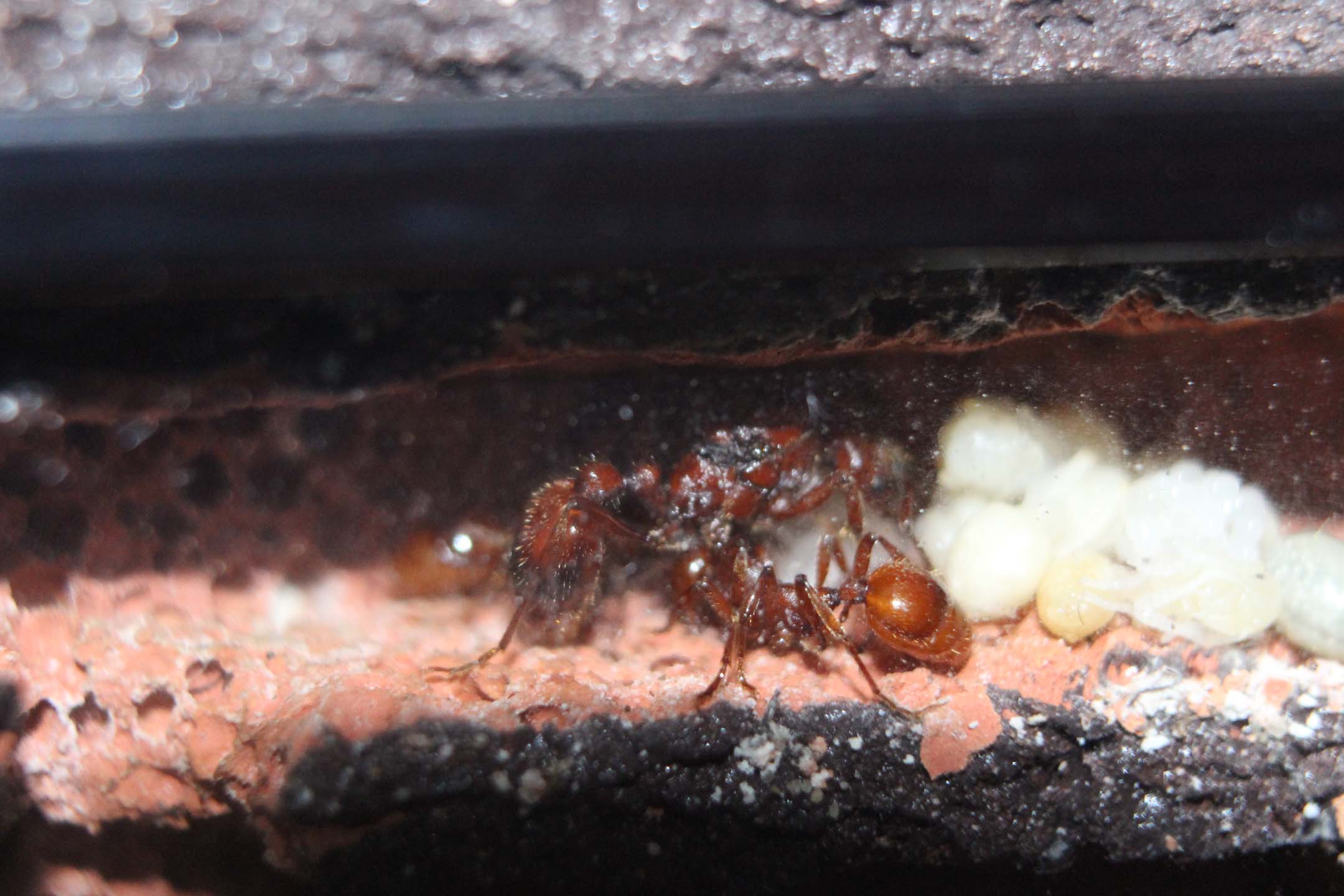 Ancora oggi mi snobba il miele ed è difficilissimo vedere operaie in giro per l'arena. Le alimento con microgrilli e zanzare, che lascio scivolare dentro il buco di accesso al formicaio (loro hanno colonizzato la prima stanza dopo l'entrata).