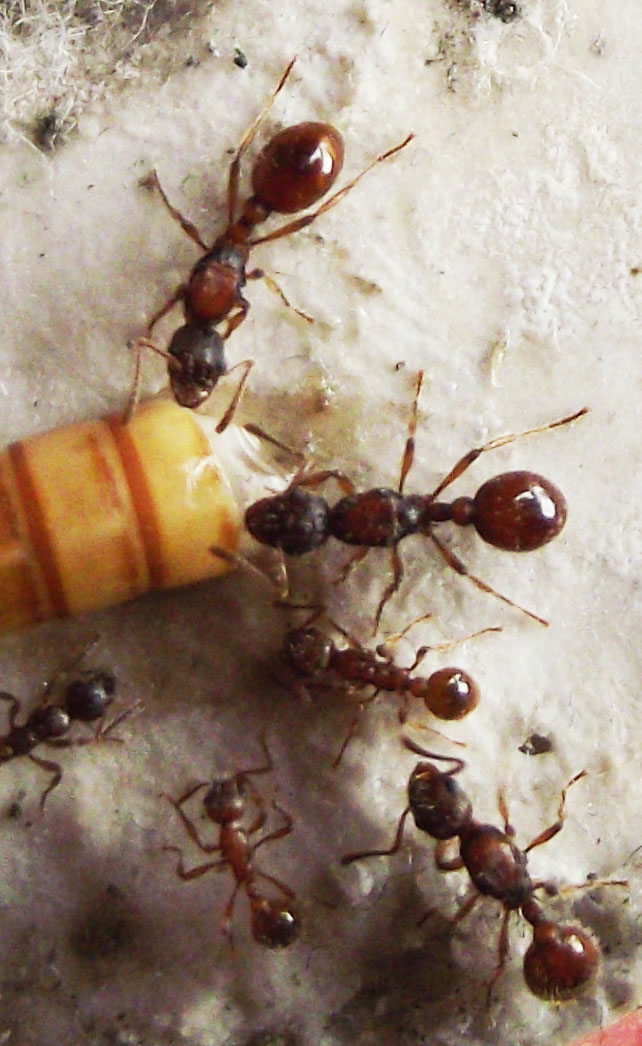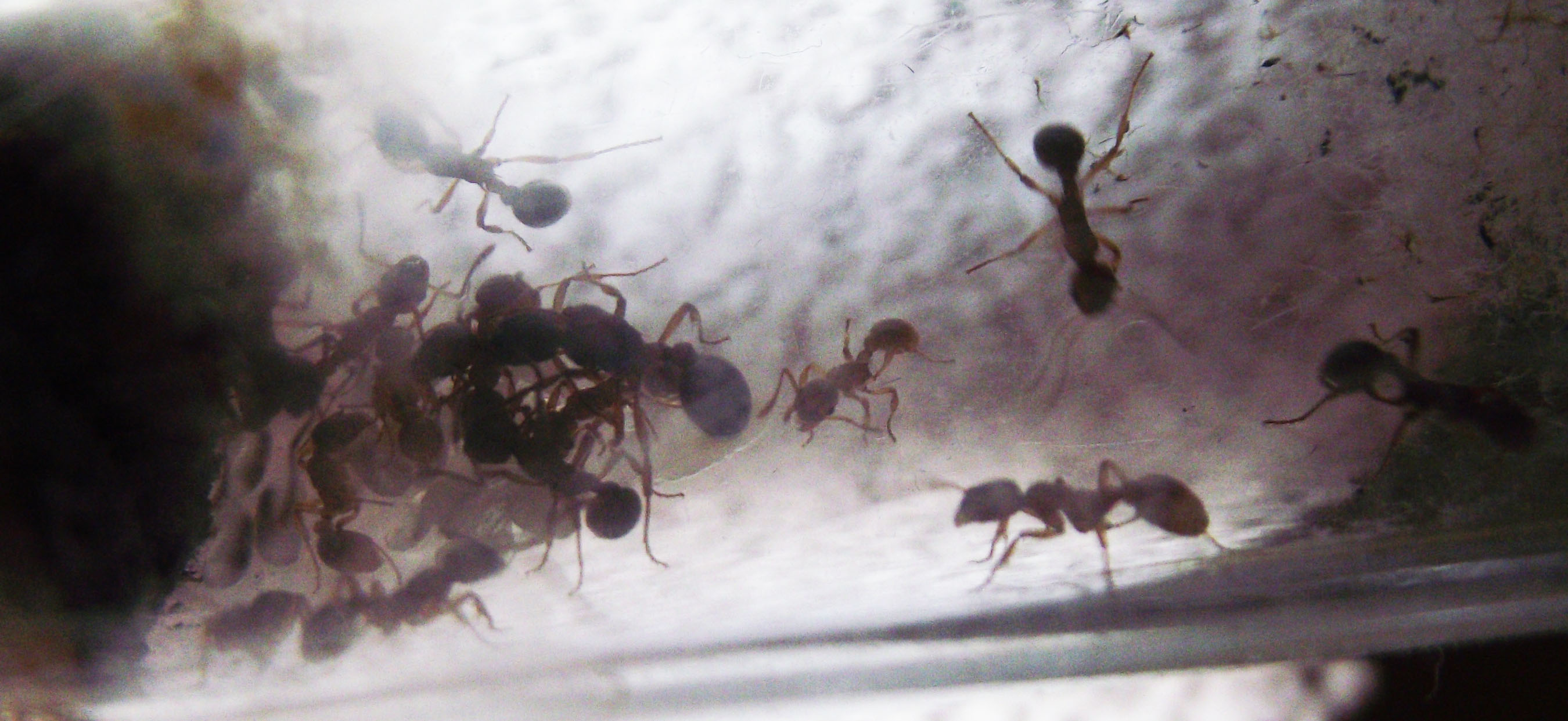 La piccola colonia cresce ma molto lentamente ed è molto poco attiva, qualche uovo una quindicina di larve e due pupe, le operaie sono una sedici ma non curano molto la pulizia della provetta ed è cosi sporca che è difficile contarle bene. Non essendo cosi attive non ho avuto ancora la necessità di aprire la provetta in una arena. Ma prevedo con la nascita delle prossime larve che si raddoppi il numero della colonia. Con la loro inattività noto anche un consumo minore di cibo.