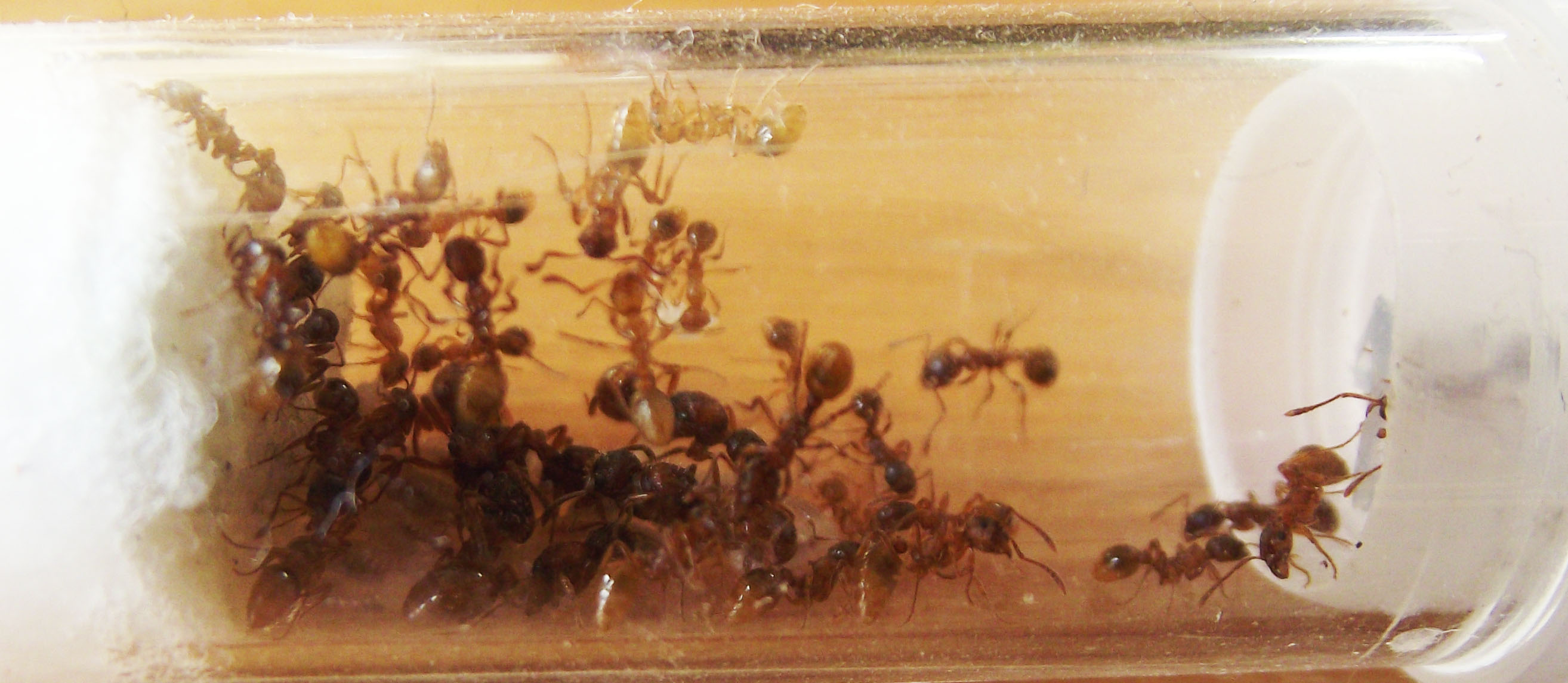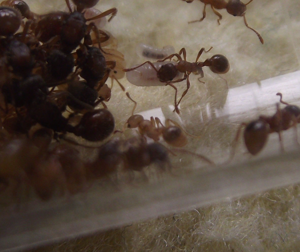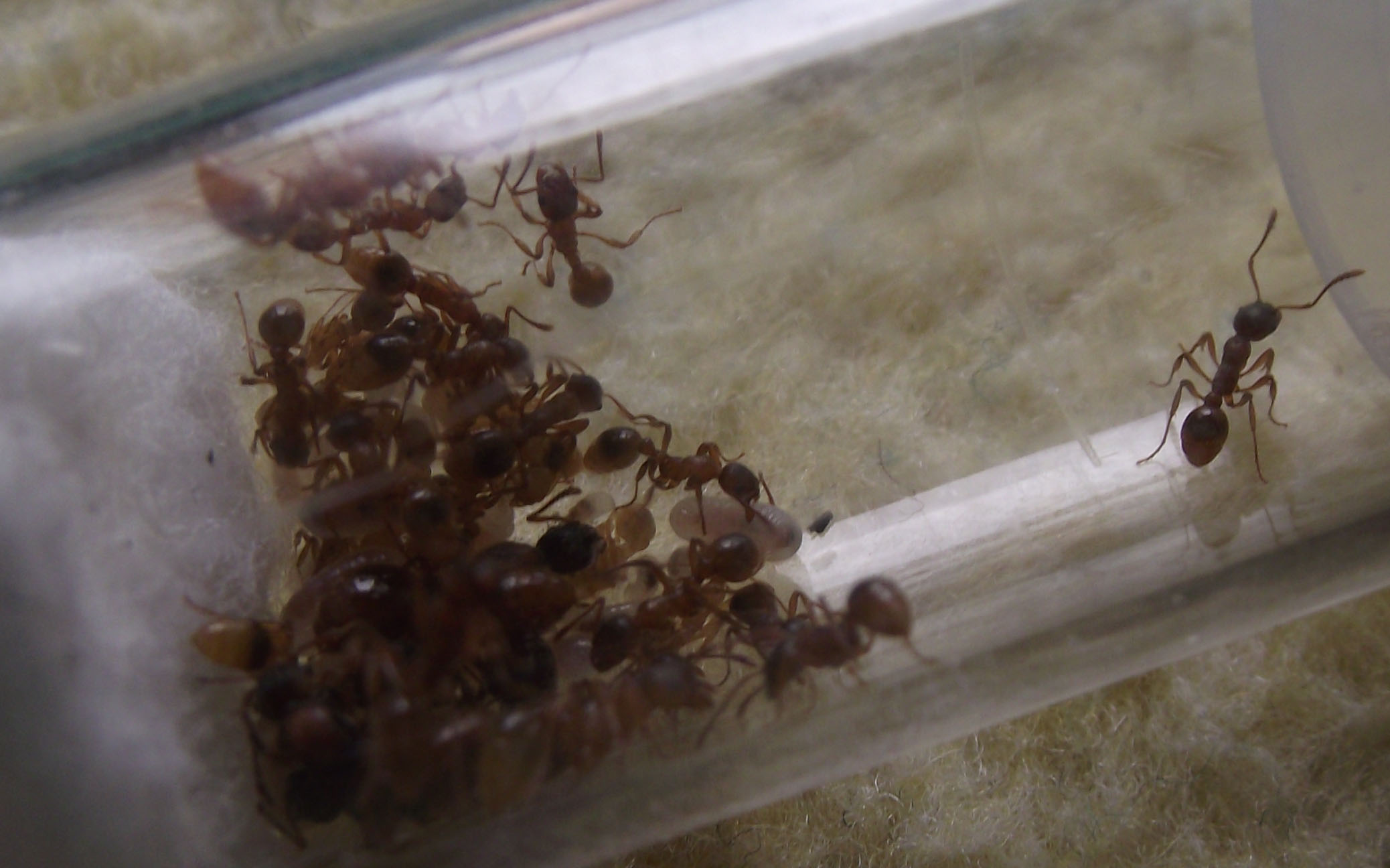 Nella notte quindi ho messo una normale provetta con serbatoio, oggi le ho trovateli dentro, regine, covata e operaie, ho chiuso la provetta col tappo e collegata con un tubo all'arena, adesso le ho potute contare meglio, sono più di 30 operaie, qualche pupa e una decina di larve, non sono sicuro di aver trovato uova.