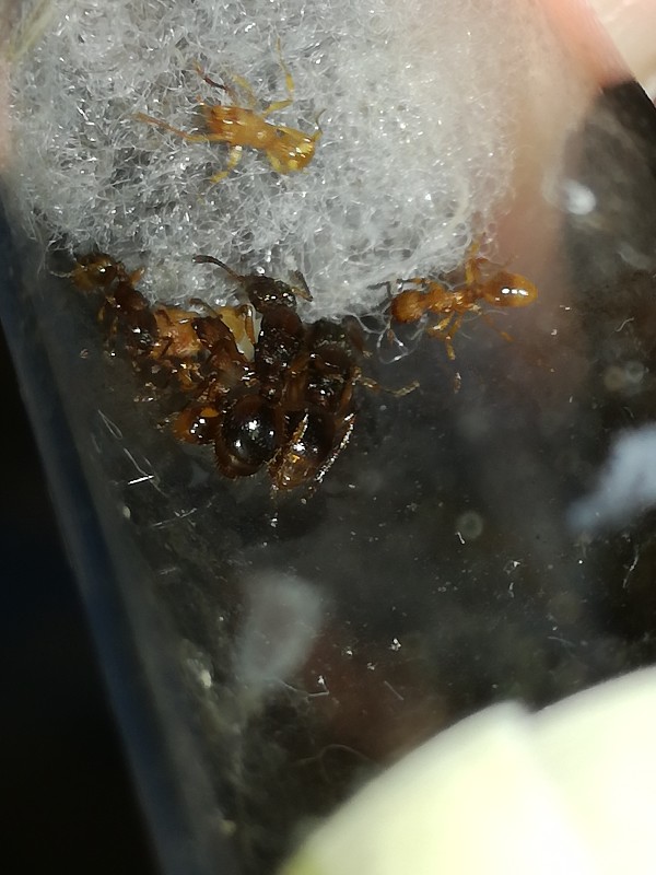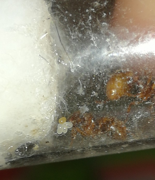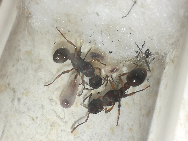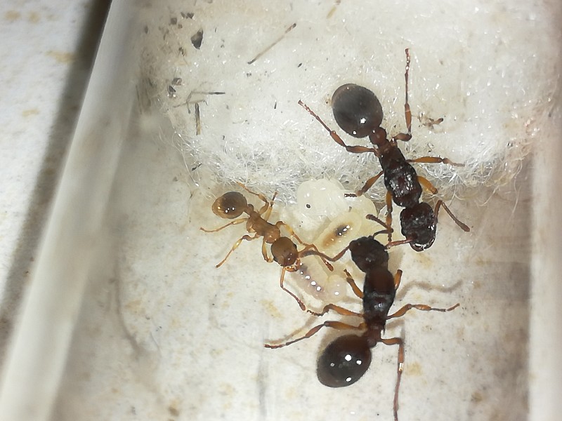 10/7/17 è nata la quinta operaia della mia colonietta, devo dire che sono molto strane, si rimangiano la covata in continuazione, le nutro ogni due giorni con insetti e acqua e zucchero, hanno sempre il gastro dilatato ma non ho mai visto le regine portare avanti più di 5 grosse larve, solitamente ce ne sono due ma una viene mangiata per portare avanti l'altra; credo che la covata sia proporzionale al numero di elementi della colonia, poiché ho osservato che la covata delle colonie e delle regine in fondazione è come se fosse rapportata, a differenza delle Lasius o delle Tapinoma, dove le regine in fondazione non smettono di deporre uova.