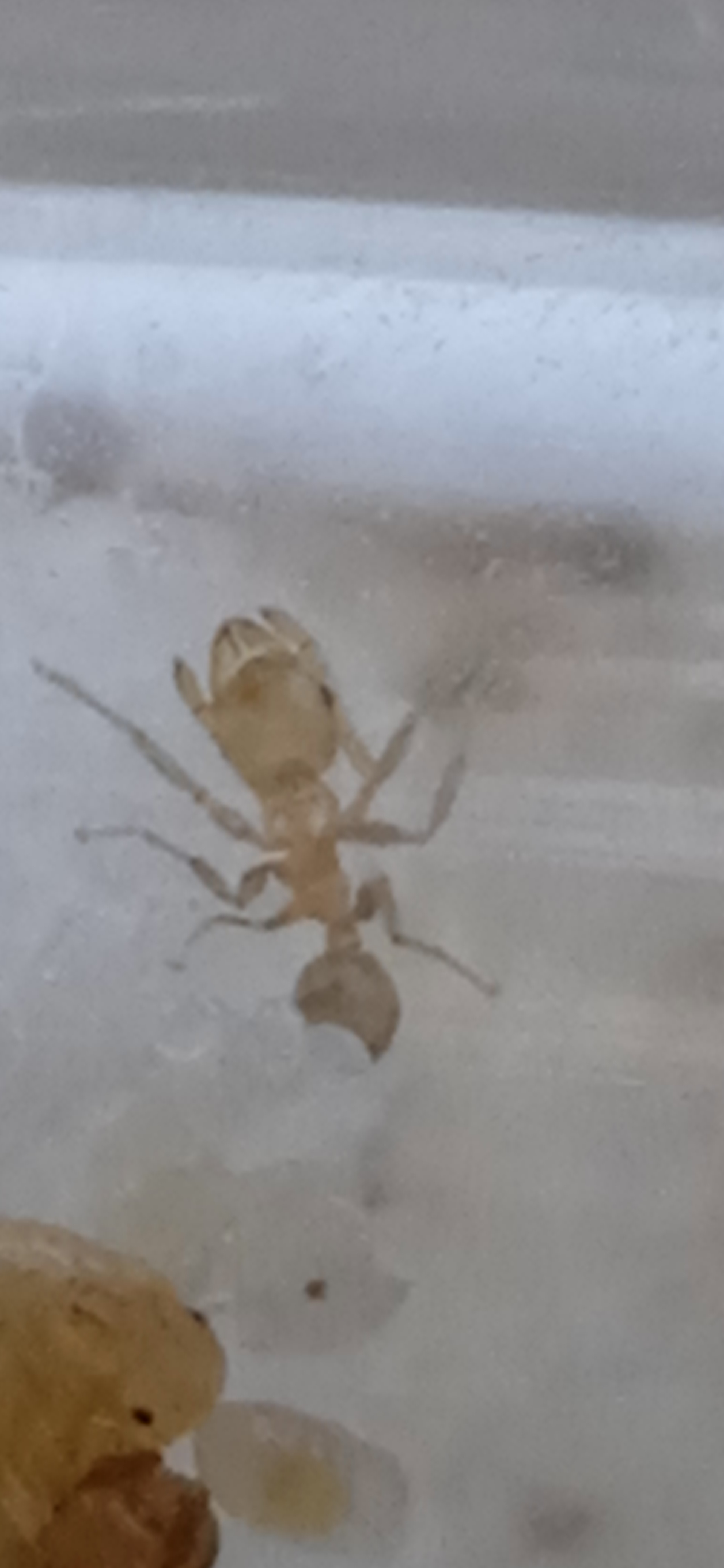 Allora tutto è iniziato quando ho visto un'operaia di P. pallidula vagare per il mio letto. Dato che io tengo le colonie nel cassetto vicino al mio letto pensavo che fossero riuscite a scappare allora l'ho messa dentro la sua provetta proveniente. Solo che non mi ero accorto che era leggermente più grande delle mie nanitiche e appena l'ho messa in provetta ho capito il mio errore: l'operaia non era della colonia. Quest'intrusa è andata subito versa la colonia e le nanitiche hanno iniziato ad attaccarla. Ho rimesso la colonia nel cassetto al buio perché avevo la certezza che le mie operaie, essendo di più, ce l'avrebbero fatta. Dopo circa 2 minuti vedo un'ammasso di operaie davanti al tappo di uscita che tengono l'intrusa e insieme a queste operaie c'era sua maestà la regina. Da lì ho capito che non erano le operaie, bensì la regina, a fare a pezzi le intruse. Ho visto la regina un po' indecisa ma alla fine ho visto che aveva preso l'iniziativa ed era andata dritta verso l'intrusa. Dopo il taglio del gastro e della testa dell'intrusa finì tutto.