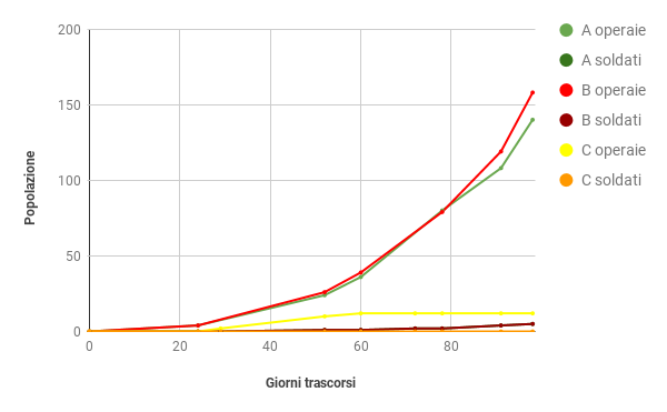 Se andiamo ad addizionare i morti nell'antifuga alla popolazione attuale delle colonie... si ottiene un andamento molto più carino! 35 vittime assegnate ad A e 25 a B. Si nota che comunque la popolazione di B sta aumentando più rapidamente. Effetto delle proteine?