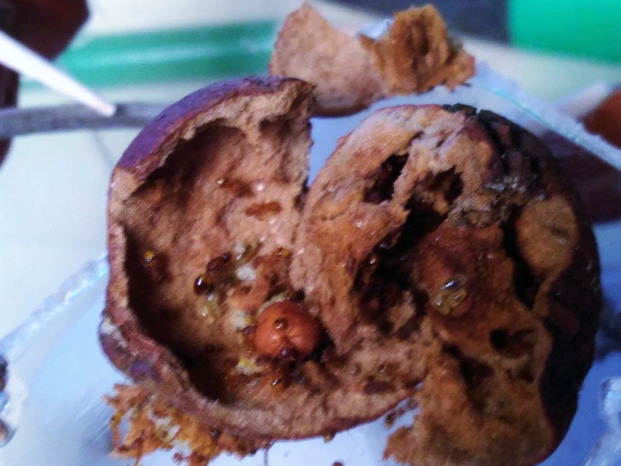 Ne approfitto per chiedervi cosa potrebbe essere l'oggetto di forma circolare che si vede nelle foto della galla aperta, oggi pulendo dai resti ho notato che è rigido, vuoto e ha un piccolo foro sopra, e alcune operaie ci entravano. Ho trovato strano che fosse così resistente mentre il resto della galla era vecchio poroso e fragile. La galla era su un esemplare di Quercus sp. , un rovere direi. Monterenzio, 200m altitudine.