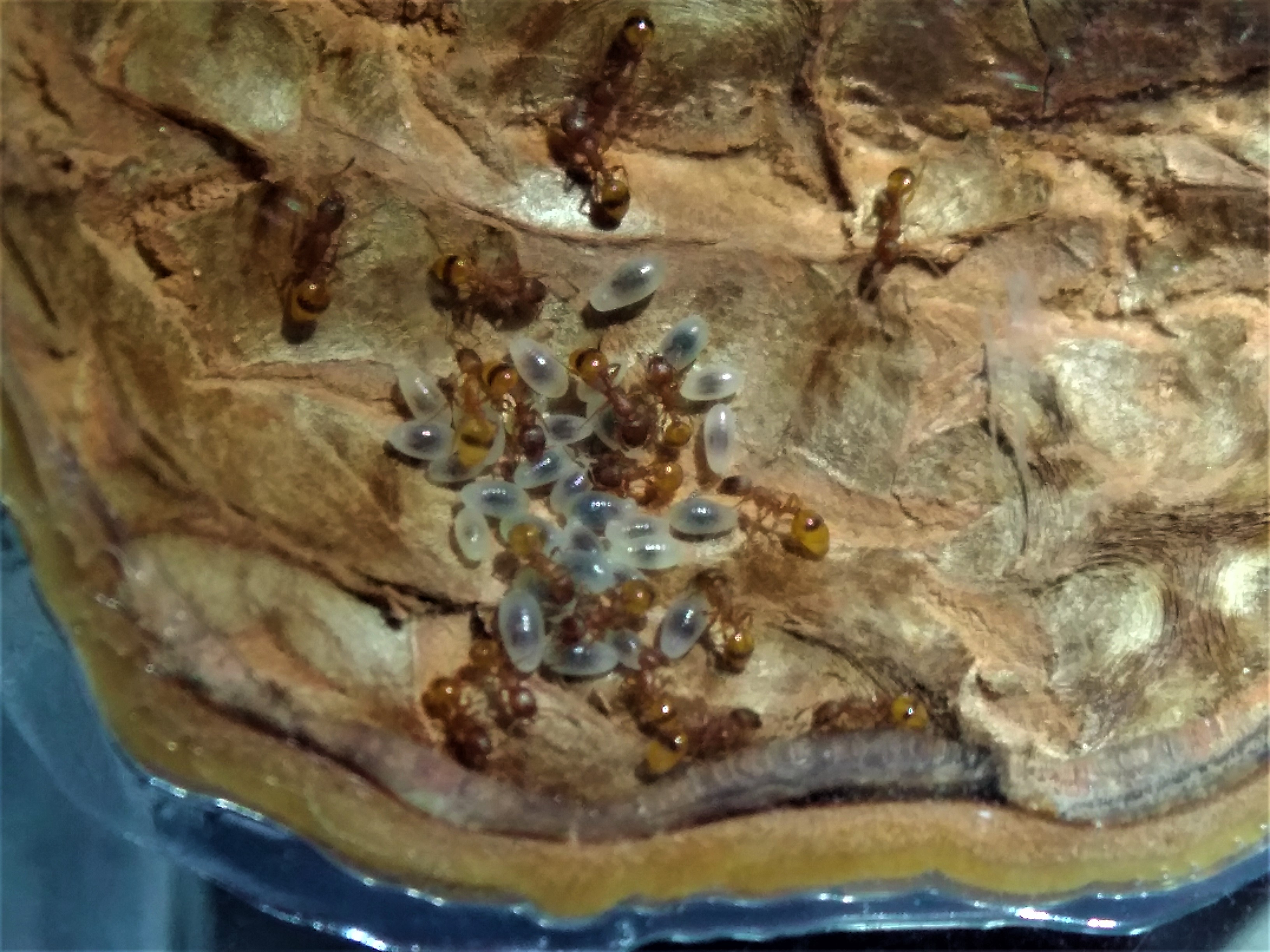 La colonia arriva da una galla trovata l'estate scorsa, non ho mai aggiunto niente; a parte pochissime larve sono tutte ormai opache e non mi sembrano diminuite di numero, a parte il piccolo mucchio che persiste ma che non è aumentato.