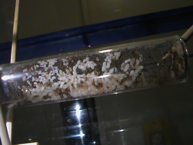 • Purtroppo ieri ho effettuato il cambio provetta e non vi era traccia della regina, sarà sicuramente nella zona pattumiera in mezzo agli altri cadaveri. Ho notato che ci sono tantissime larve ancora in sviluppo, ma sembrano di maschi, in oltre ci sono ancora tantissime uova ma dubito siano operaie, sicuramente saranno altri sessuati....