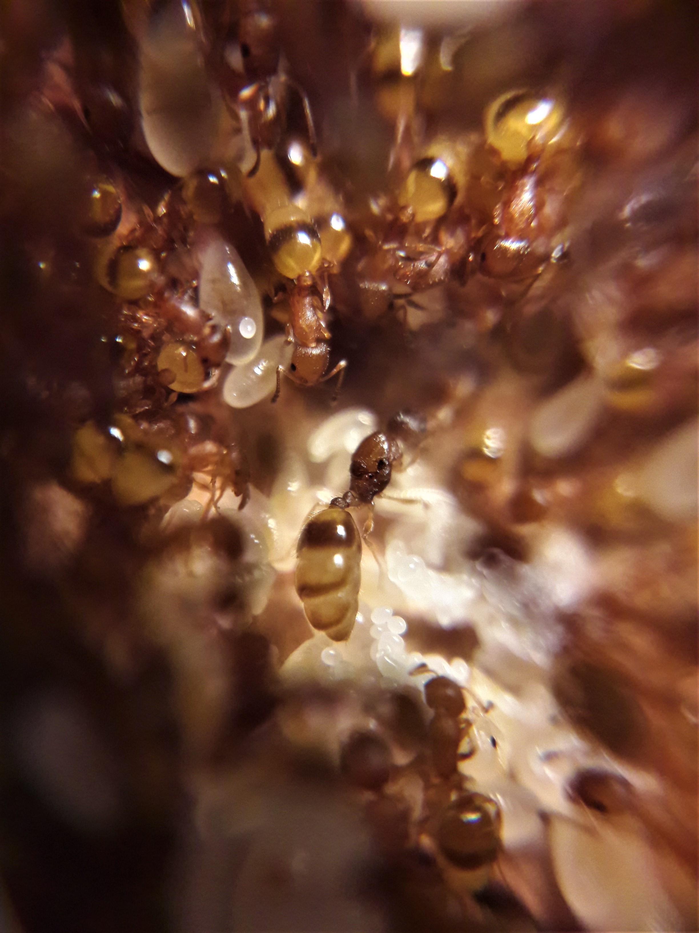 -entoK aveva avuto esperienze di operaie che depongono uova, possibile che le uova che ci sono nelle stanze siano in realtà state deposte da operaie ‘femminizzate’? ho notato in effetti alcune operaie con il gastro di grosse dimensioni ma non sono sicuro sia un vero indizio.