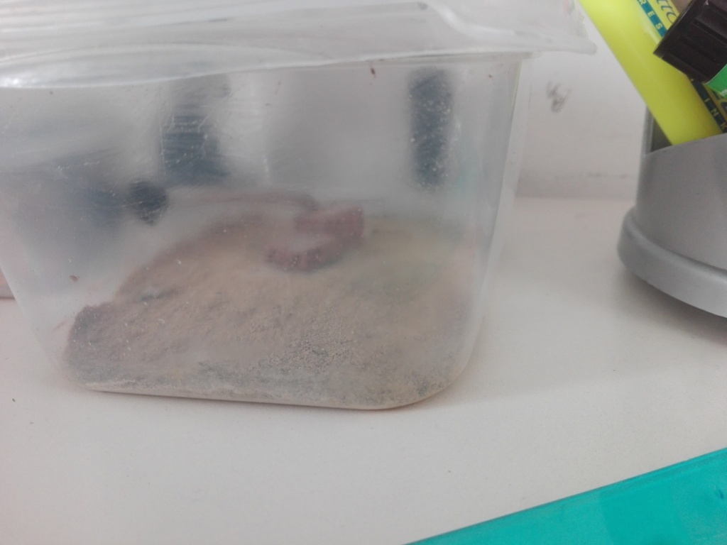 Ho riversato brutalmente il nido di cotone in arena, costringendo la colonia ad uscire e cercare una nuova casa più confortevole e meno ammuffita, ma continuavano a vagare per l' arena e stabilirsi in ogni punto disponibile, frammentandosi. Non ho foto della situazione ma sarebbe stato interessante mostrarle, quindi cercherò di descriverla: -una decina di operaie si erano stabilite sotto al tubo di collegamento tra arena e formicaio, sotto il "pongo" sigillante da elettricista insieme ad una ventina di piccole uova;
