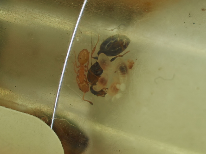Finalmente questa micro colonia ha cambiato marcia, in poco più di un mese tre operaie e le larve vengono portate tutte a diventare adulti, non vi nego che ho temuto il peggio, una lentezza che non faceva presagire nulla di buono ma forse per questa specie funziona così e a questo punto con ben cinque operaie (vi sembrerà un inezia) ed è un risultato soddisfacente e tutto procede con grande appetito di proteine.