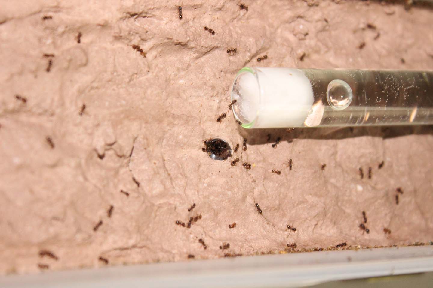Anzitutto ho eliminato il ghiaino lavico. Essendo formiche molto piccole e abili nel nascondersi alla vista, la sperimentazione del ghiaino su questa specie è fallita, poichè riescono a creare piccoli tunnel nei quali spariscono.