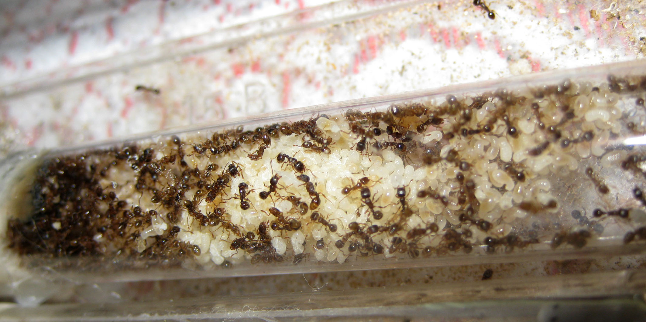 La colonia ha una sola regina, ma in questo non si differenzia molto dalle mie esperienze precedenti: appena superata la cinquantina di operaie, questa si è scatenata a deporre al pari di Pheidole e T. caespitum , raggiungendo in pochi mesi un ragguardevole numero di operaie, e una covata da far invidia a Pheidole pallidula.