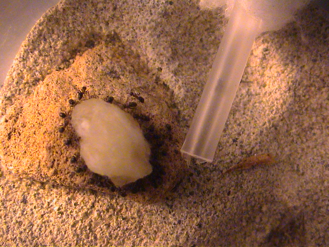Anche con gli insetti è più o meno la stessa cosa... lo trascinano immediatamente dentro la provetta per mangiarlo in tutta calma, quando riescono a farlo passare attraverso la cannuccia, altrimenti lo smembrano in arena.
