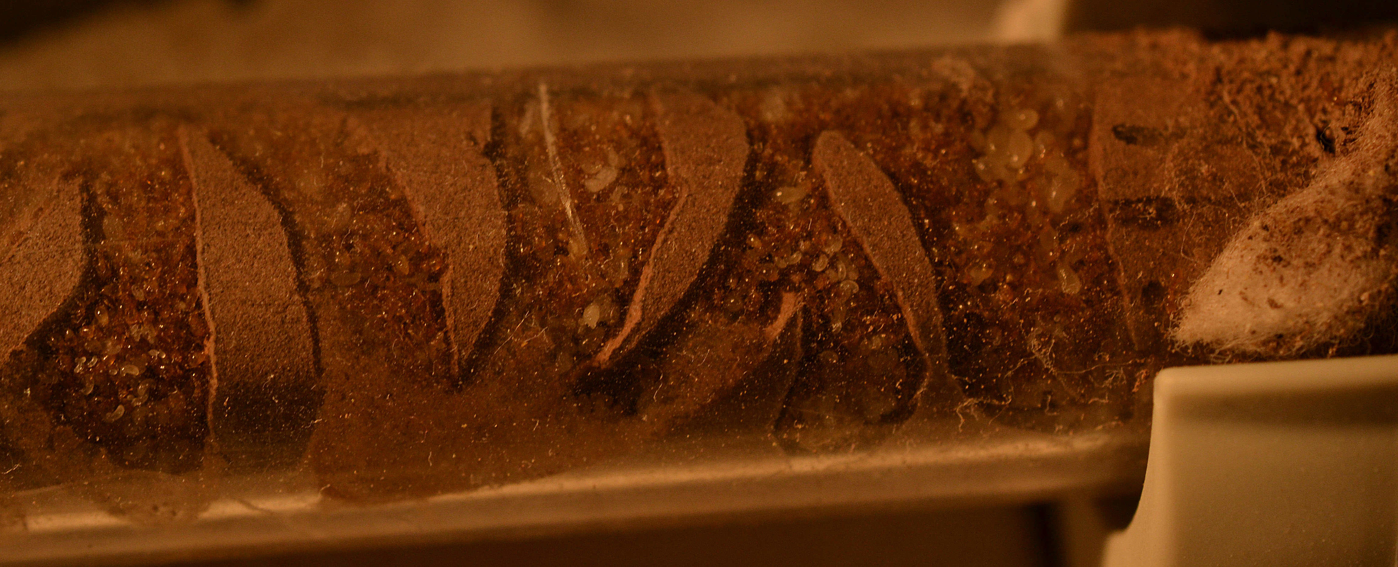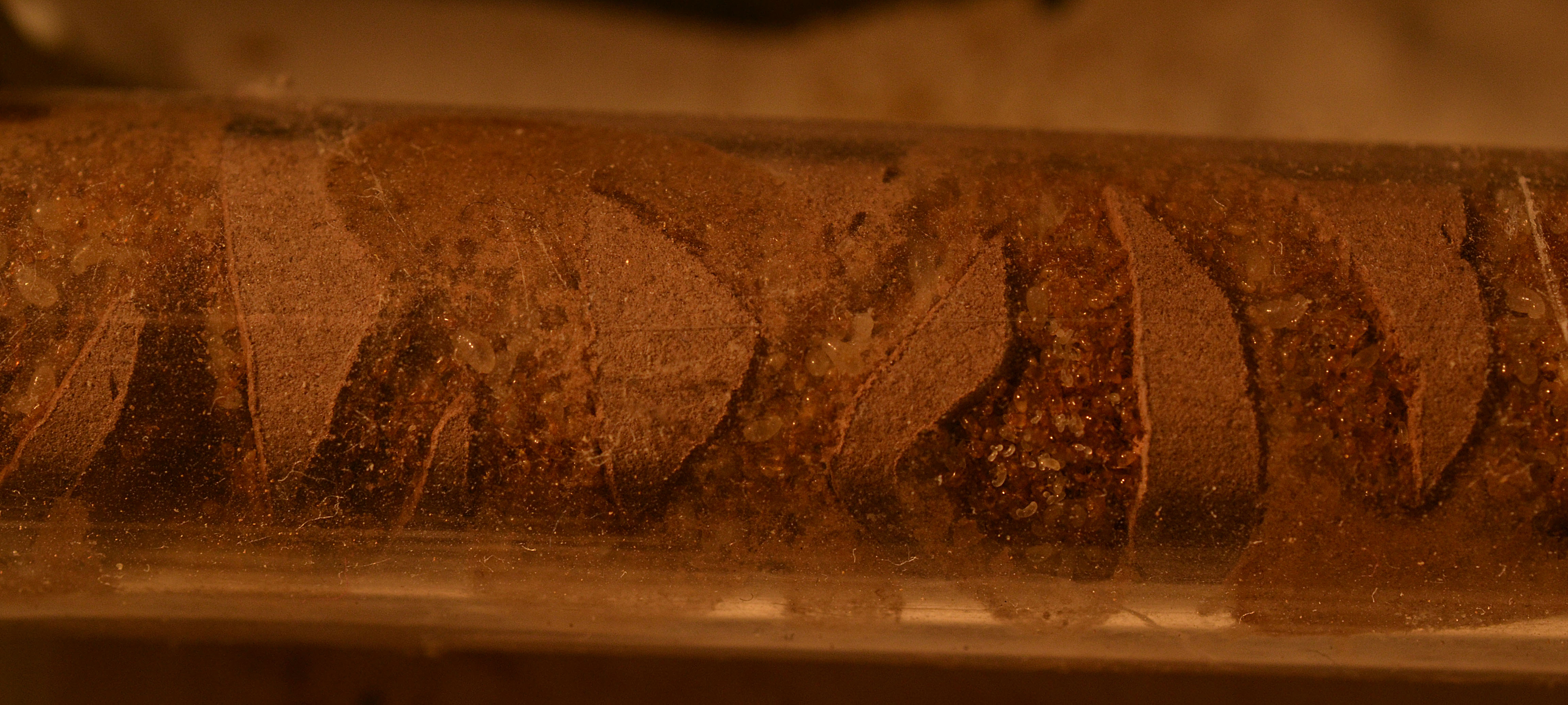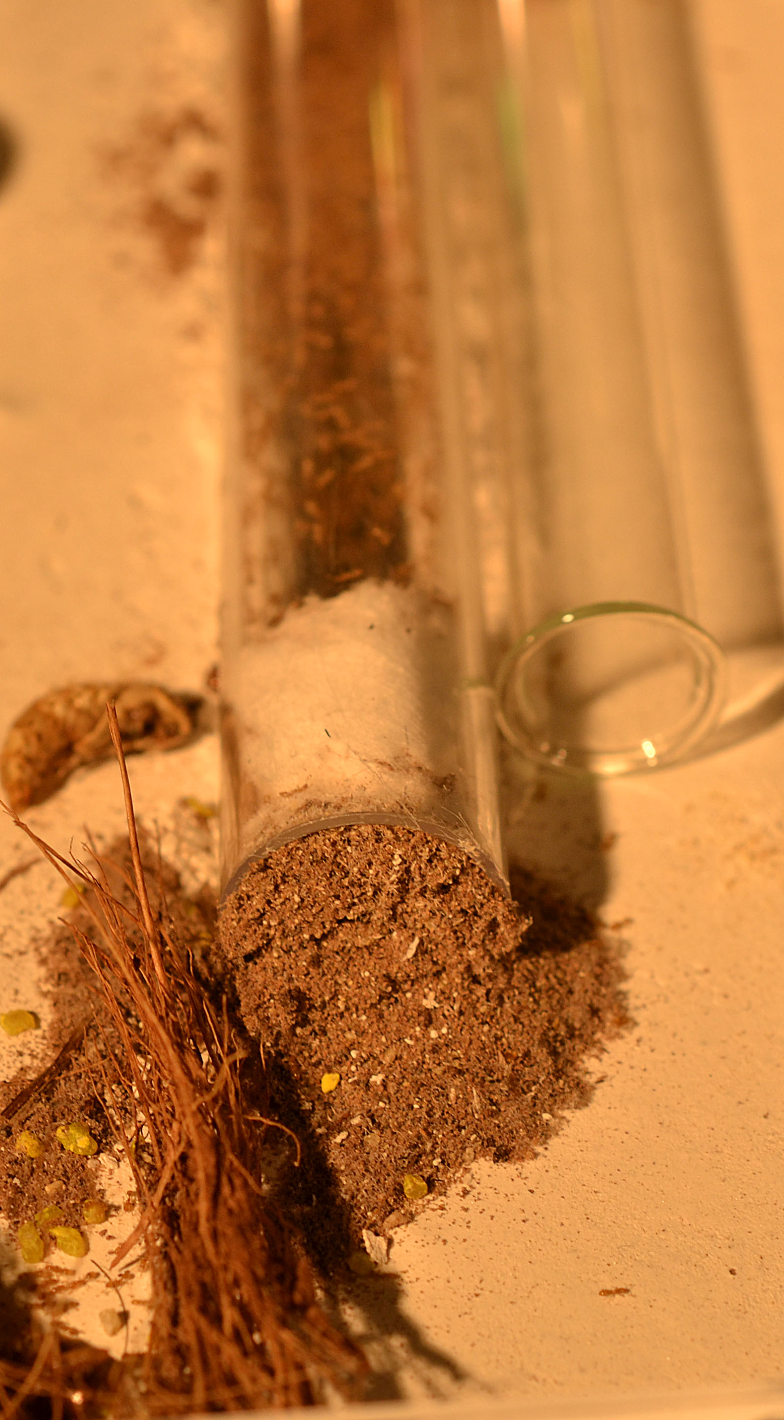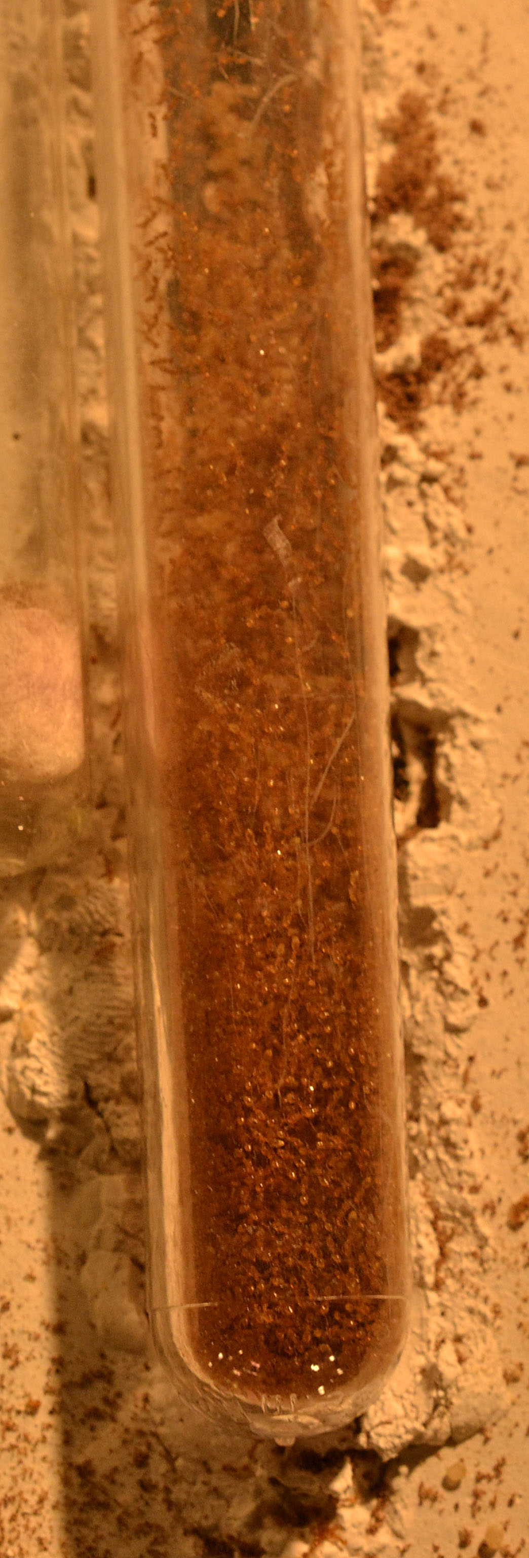Come previsto la colonia ha 'snobbato' il nido in acrilico, occupando saltuariamente parte delle stanze (quando era presente un'elevata umidità). Durante la mia assenza (causa ferie) hanno invece deciso di occupare una provetta/serbatoio ormai esaurita, sigillandone l'ingresso con detriti vari e polvere di gesso (cercando così di mantenere alta l'umidità all'interno).