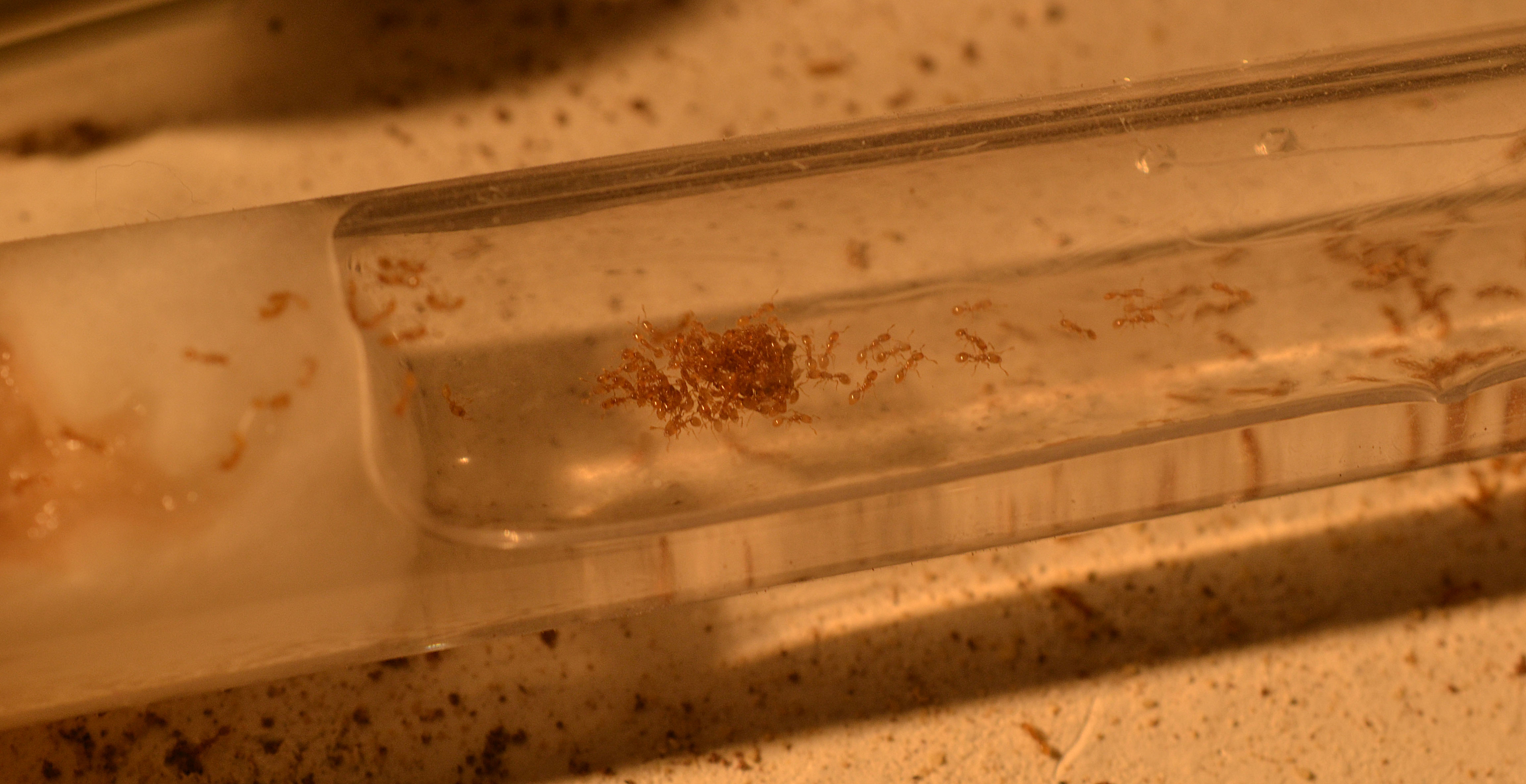 Negli ultimi giorni inoltre, hanno forato il tappo dell'attuale provetta/serbatoio entrando nella parte contenente l'acqua. Qui ho potuto notare il loro comportamento in risposta a questa situazione. Le operaie hanno subito formato un piccolo agglomerato utilizzando i loro corpi, mentre altre si sono messe a 'passeggiare' sopra la superficie dell'acqua stessa...degne delle loro cugine! Per il momento le lascio fare e mi limito ad osservare, sono comunque una minima parte della colonia.