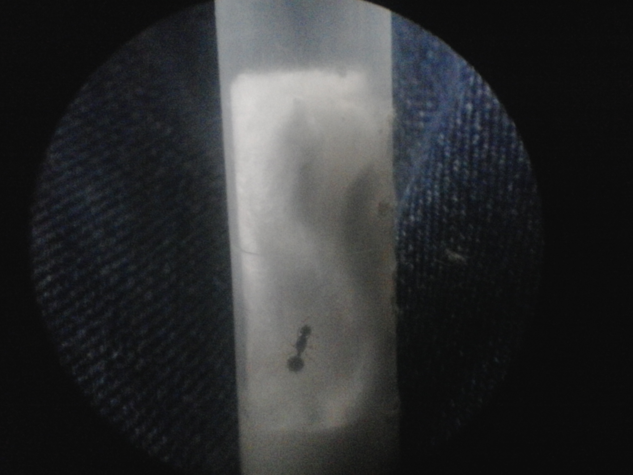 La regina appena arrivata (sana e salva) era in continuo movimento ho levato un po' di cotone dal tappo ed ora ce nè circa 1,5 cm la distanza fra cotone asciutto e e cotone inumidito è di 1cm oggi mentre levavo il cotone in più senza volere è uscita sola, così io ho realizzato un cunicolo che attraversa il cotone asciutto e portava la formica nella parte interessata cioè la stanza della regina quella di grandezza 1cm... Ho puntato la luce sopra la provetta dove era la regina e dopo pochi istanti si è addentrata nel cunicolo ed è rientrata nella sua stanza in questo momento è piegata con la testa verso l'addome speriamo deponga presto ecco alcune immagini vi aggiorneró ad ogni avvenimento fondamentale